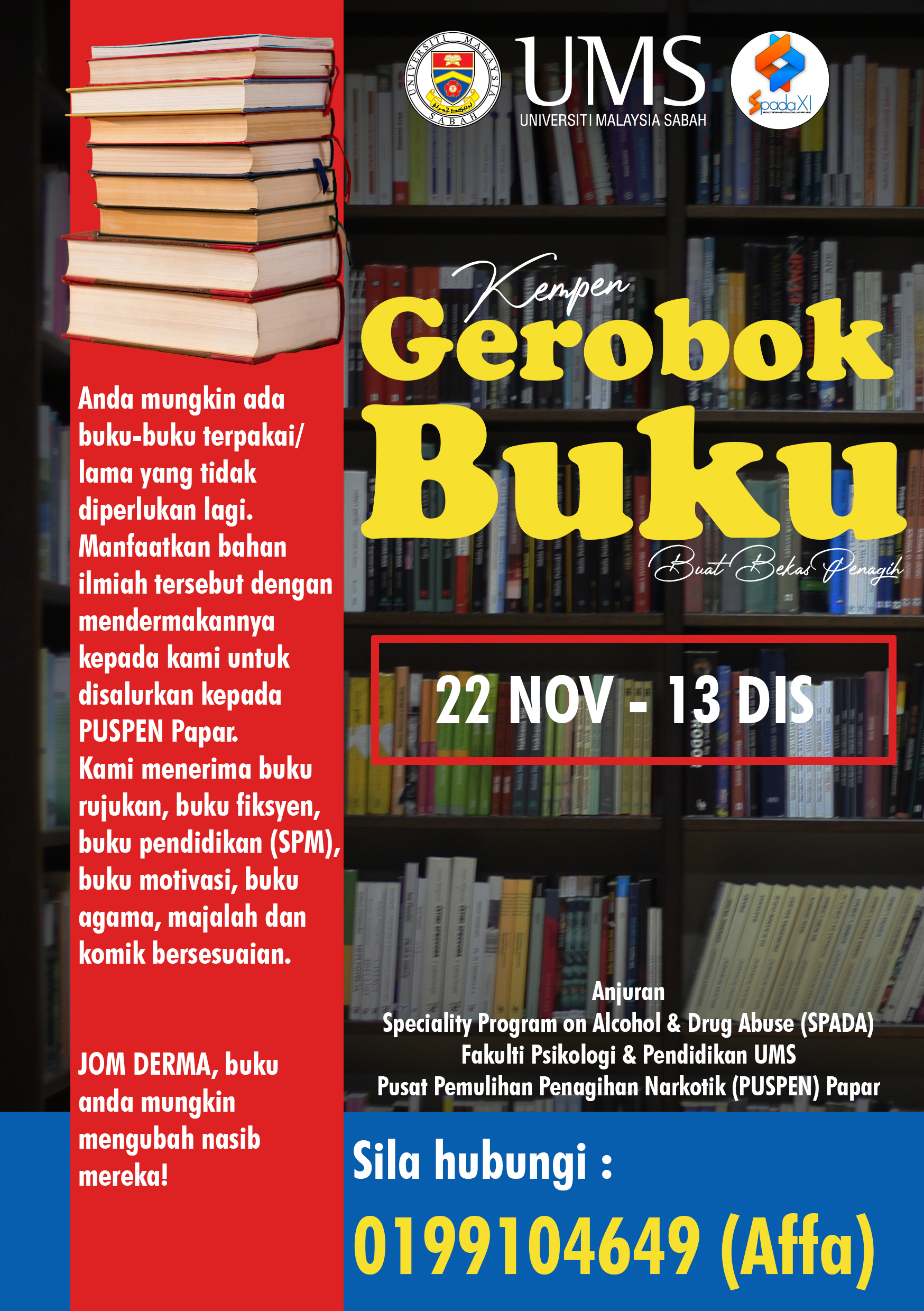 Kami merayu sekiranya terdapat buku-buku terpakai atau lama yang tidak diperlukan lagi, manfaatkannya atau dermakannya kepada kami untuk disalurkan kepada penghuni-penghuni Puspen Papar yang dahagakan ilmu pengetahuan. Barangkali buku anda boleh mengubah nasib mereka.