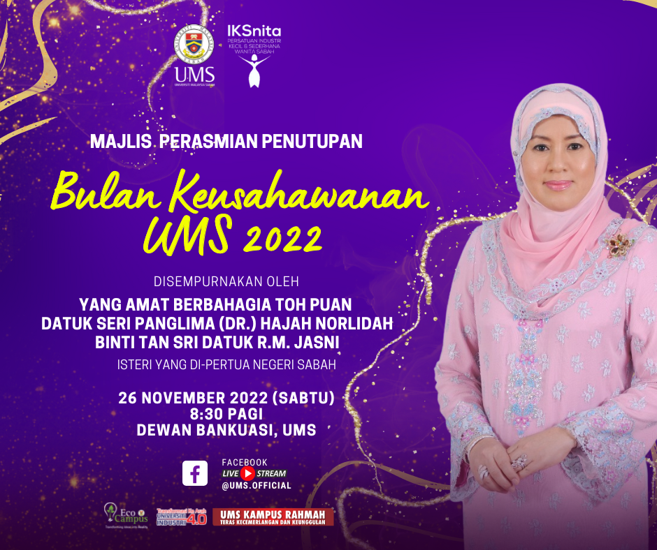 Adalah dimaklumkan bahawa Pusat Kerjaya dan Pembangunan Keusahawanan Pelajar dengan kerjasama pihak Persatuan IKSnita Sabah akan mengadakan Majlis Perasmian dan Penutupan Bulan Keusahawanan UMS yang akan dirasmikan oleh Y.A.Bhg Toh Puan Datuk Seri Panglima (DR) Hajah Norlidah Binti Tan Sri Datuk R. M Jasni pada ketetapan berikut;