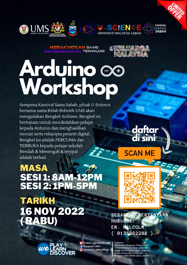 Bengkel ini bertujuan untuk mendedahkan kepada para pelajar asas Arduino, memahami fungsi microprocessor ini dan bagaimana memprogramkan peranti ini, serta potensi inovasi yang boleh diaplikasikan. Adakah anak anda berminat?