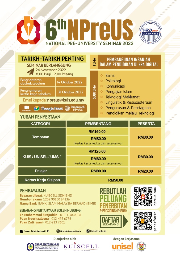 We are pleased to invite Y.Bhg. Prof./ Assoc. Prof./ Dr./ Sir/ Madam to 6th National Pre-University Seminar 2022 (6th NPreUS 2022), organised by Matriculation Centre of KUIS in collaboration with KUISCELL Sdn Bhd (KUISCELL), Pusat Pengajian Asasi dan Umum, Universiti Selangor (UNISEL), and Pusat Penataran Ilmu dan Bahasa, Universiti Malaysia Sabah (UMS).