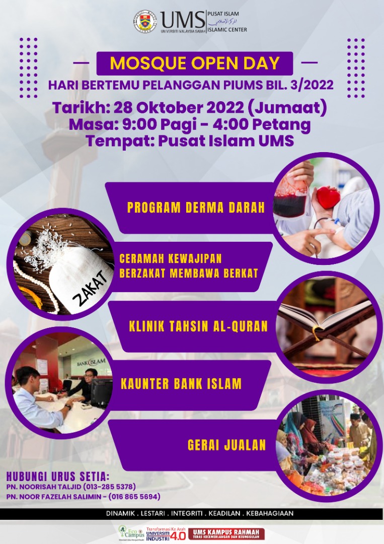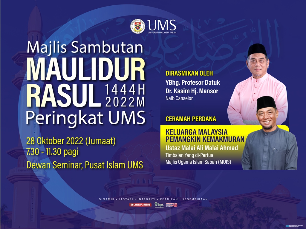 Majlis Sambutan Maulidur Rasul Peringkat Universiti Malaysia Sabah Bagi Tahun 2022 / 1444H akan berlangsung esok di Dewan Seminar, Pusat Islam UMS.