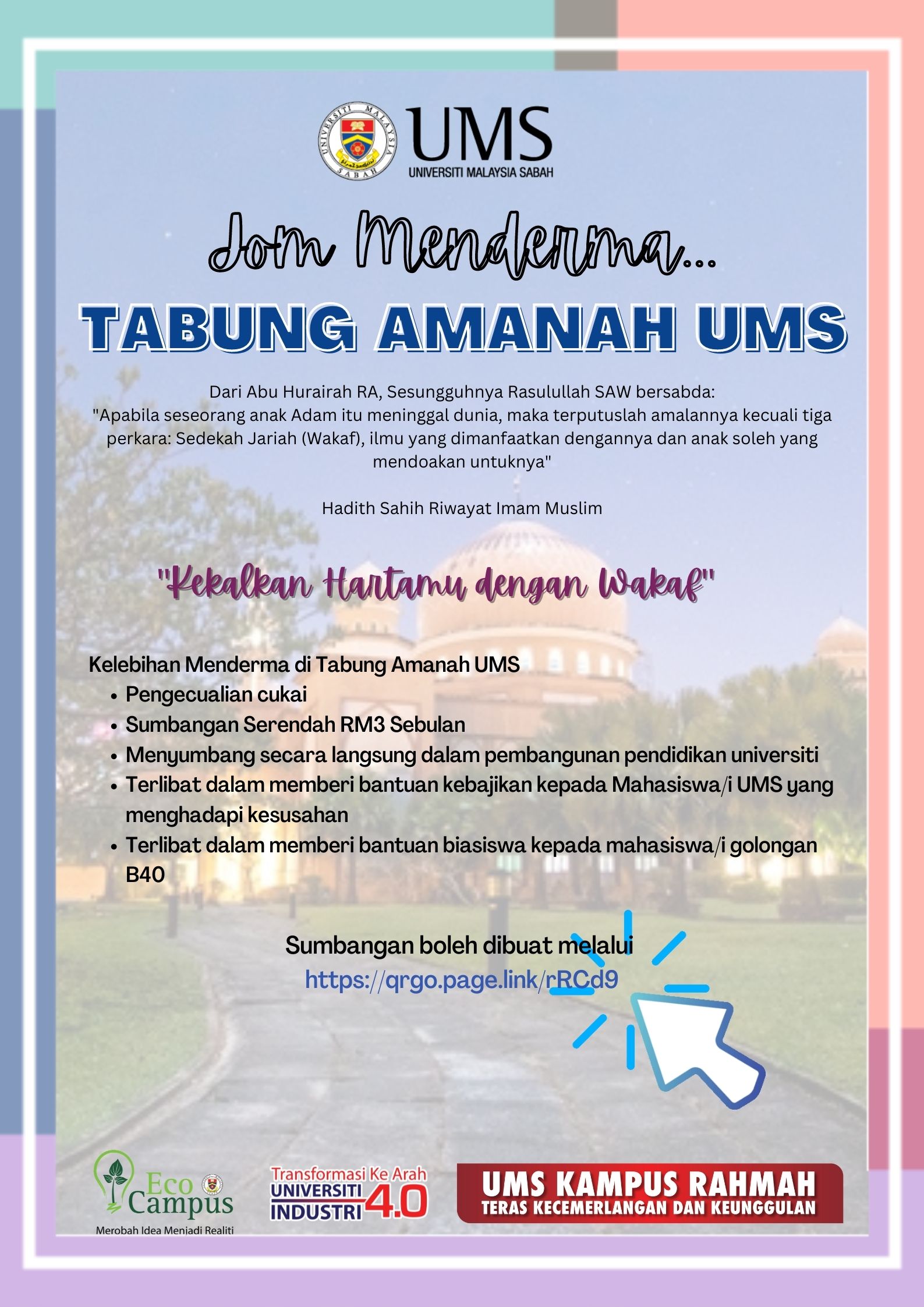 Dimaklumkan bahawa UMS melalui Pusat Pelaburan, Endowmen dan Wakaf (CIEW) mengadakan kempen sumbangan staf ke Tabung-Tabung Amanah UMS (Endowmen dan Wakaf) melalui potongan gaji dengan sumbangan minimum RM3.00 sebulan. Sumbangan akan digunakan untuk membantu pelajar UMS yang kurang berkemampuan dan amat memerlukan bantuan kewangan. Selain itu, sumbangan juga akan digunakan selaras dengan TOR Tabung-Tabung Amanah UMS yang mana sekaligus membantu dalam pembangunan pendidikan Universiti.