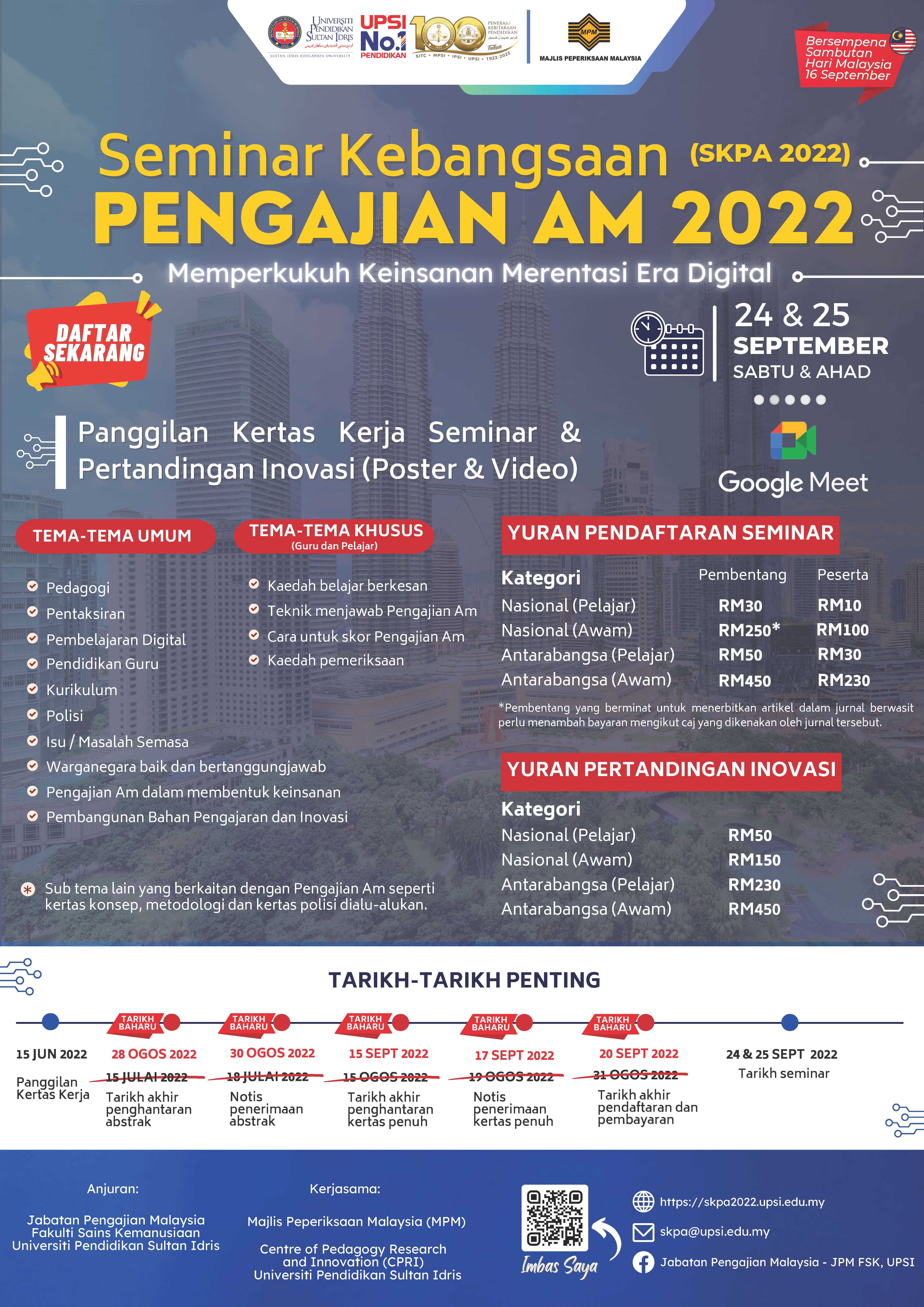 2. Sukacita dimaklumkan bahawa Jabatan Pengajian Malaysia (JPM), Fakulti Sains Kemanusiaan, dengan kerjasama Pusat Pedagogi, Penyelidikan dan Inovasi (CPRI), Universiti Pendidikan Sultan Idris dan Majlis Peperiksaan Malaysia (MPM) akan menganjurkan Seminar Kebangsaan Pengajian Am (SKPA) 2022 untuk julung-julung kalinya.