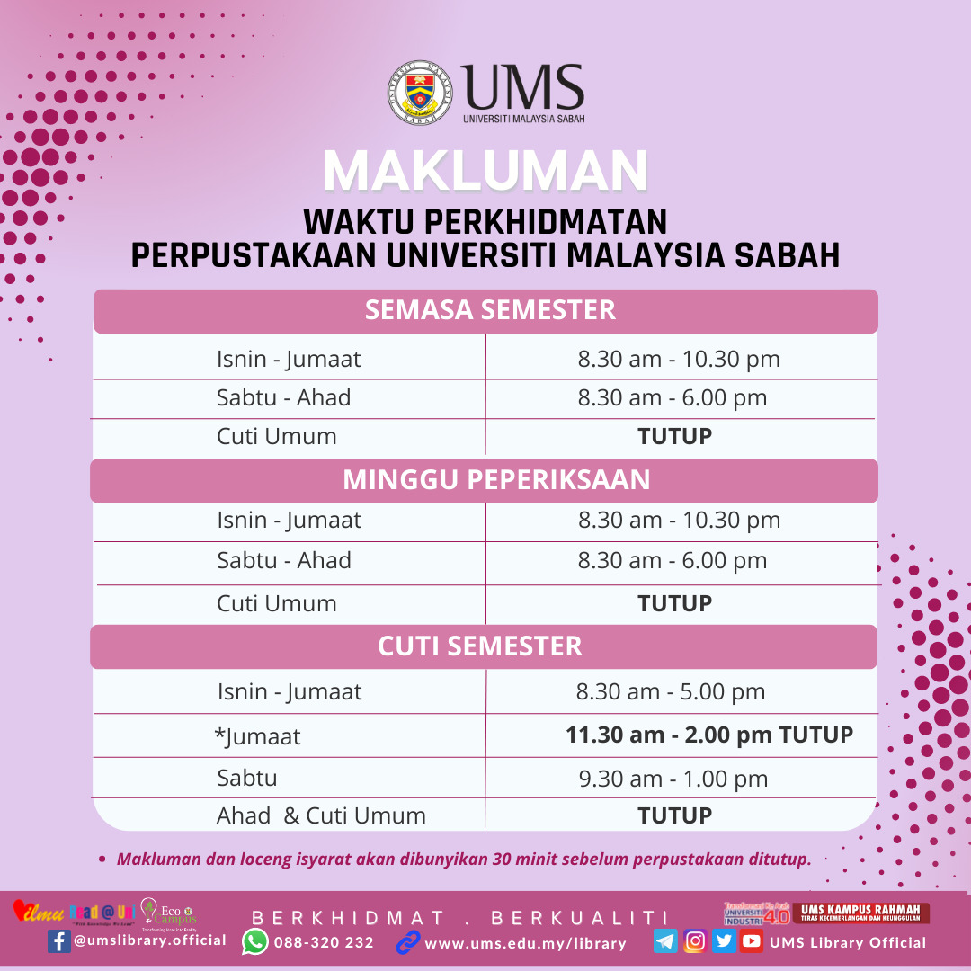 Dimaklumkan bahawa waktu perkhidmatan Perpustakaan UMS adalah seperti berikut. Jika anda mempunyai pertanyaan mengenai denda, tempoh pinjaman, permohonan kelas literasi atau pertanyaan lain, sila WhatsApp kami di talian 088-320 232 atau emelkan ke Alamat emel ini dilindungi dari Spambot. Anda perlu hidupkan JavaScript untuk melihatnya..