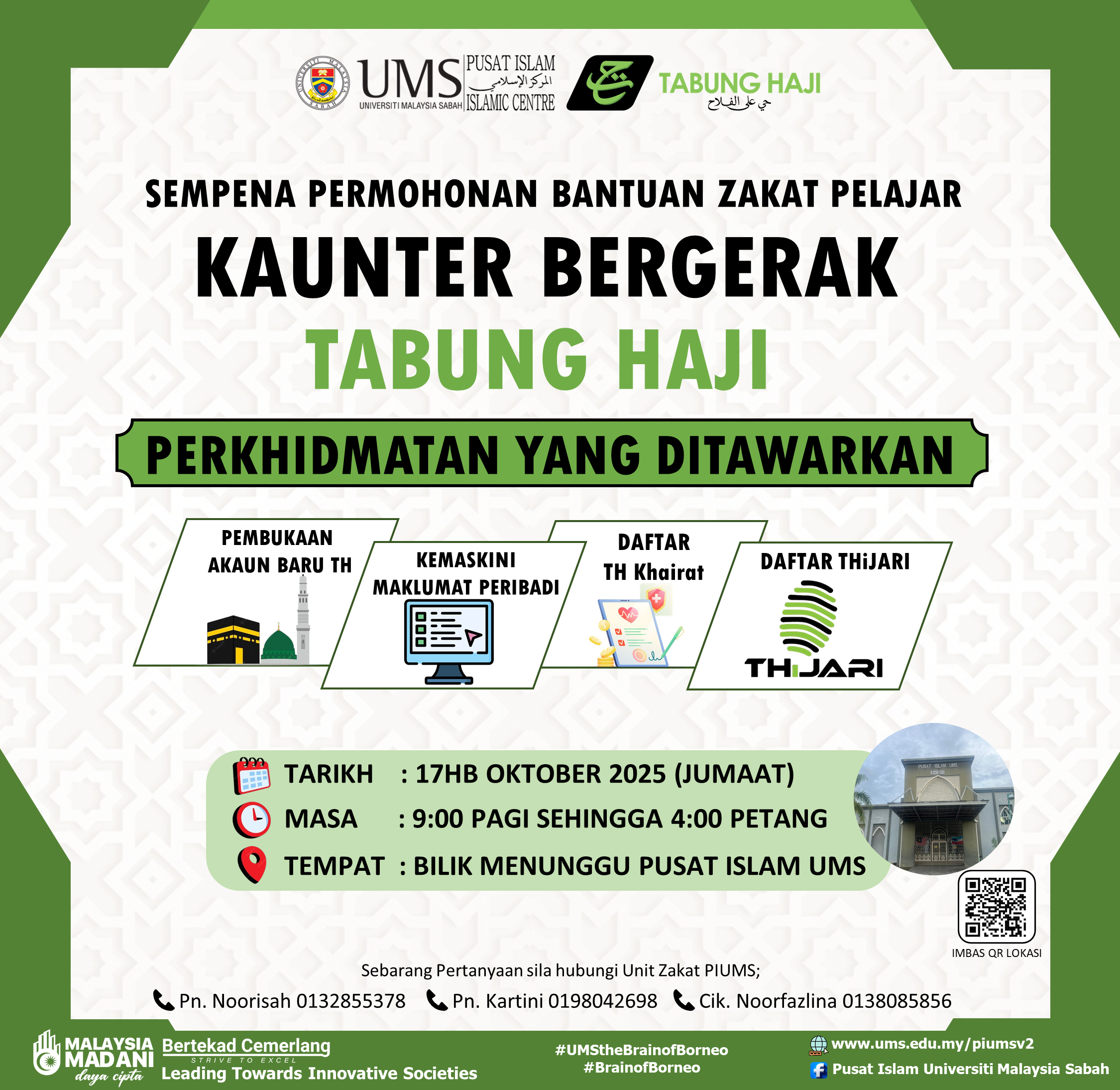 Pusat Islam UMS dengan kerjasama Tabung Haji akan mengadakan kaunter bergerak Tabung Haji pada ketetapan berikut:-