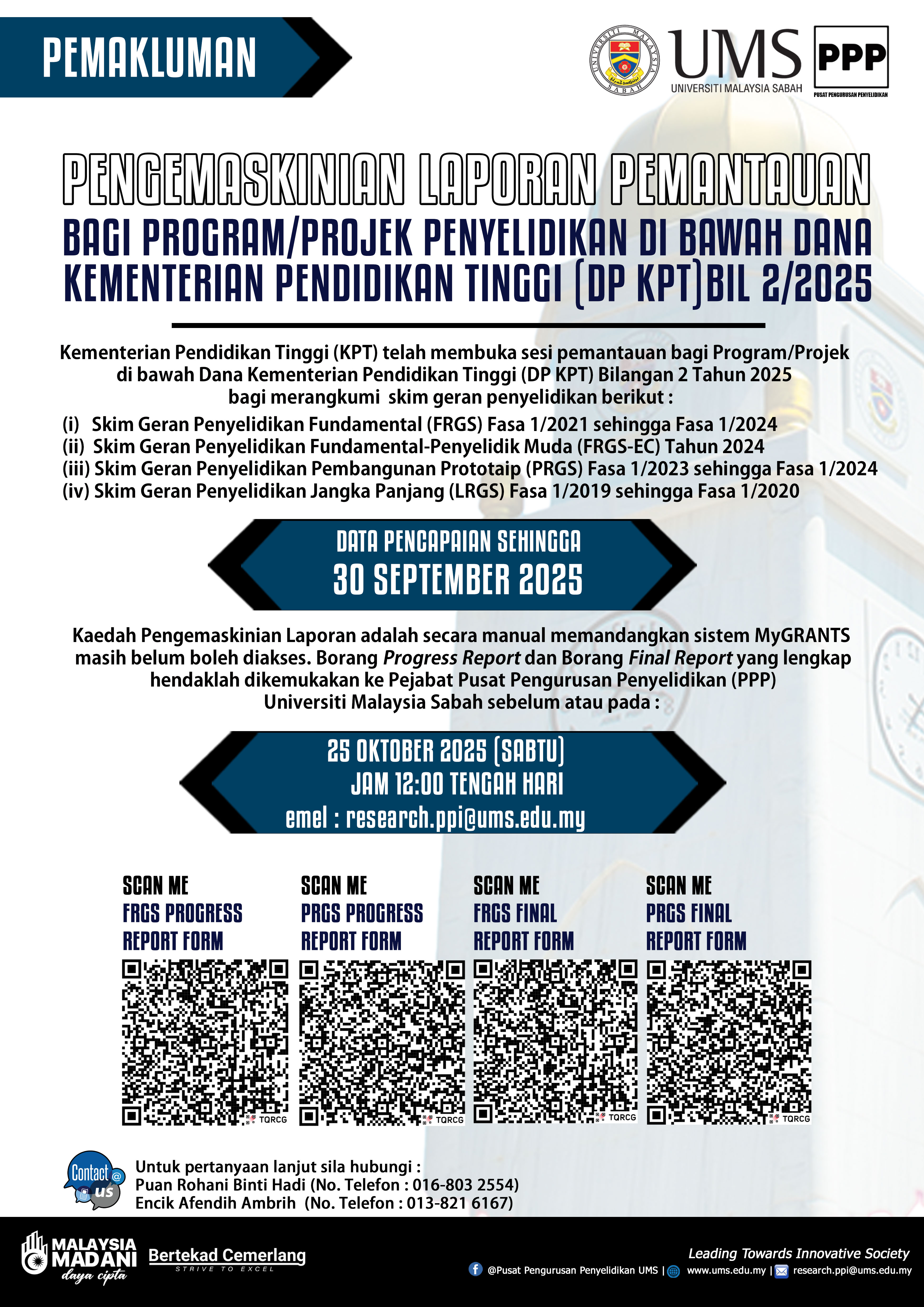 Laporan Prestasi bagi kitaran pemantauan bilangan 2 Tahun 2025 hendaklah disediakan secara manual memandangkan Sistem MyGRANTS masih tidak dapat diakses pada masa ini. Pelaporan adalah pencapaian data sehingga 30 September 2025 bagi semua projek penyelidikan mengikut geran penyelidikan masing-masing. Bagi projek yang telah berstatus tamat, ketua penyelidik hendaklah mengemukakan Laporan Akhir mengikut format yang telah disediakan dengan mengisi Borang Final Report yang dilampirkan. Borang-borang berkaitan boleh di muat turun melalui Kod Qr yang tertera di poster infografik.