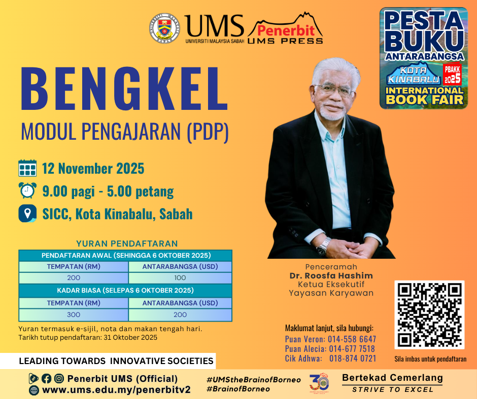 Sempena Pesta Buku Antarabangsa Kota Kinabalu (PBAKK) 2025, Penerbit UMS dengan sukacitanya menjemput warga akademik, pelajar dan orang awam untuk menyertai Bengkel Penulisan Modul Pengajaran (PDP) yang disampaikan oleh Dr. Roosfa Hashim, Yayasan Karyawan.