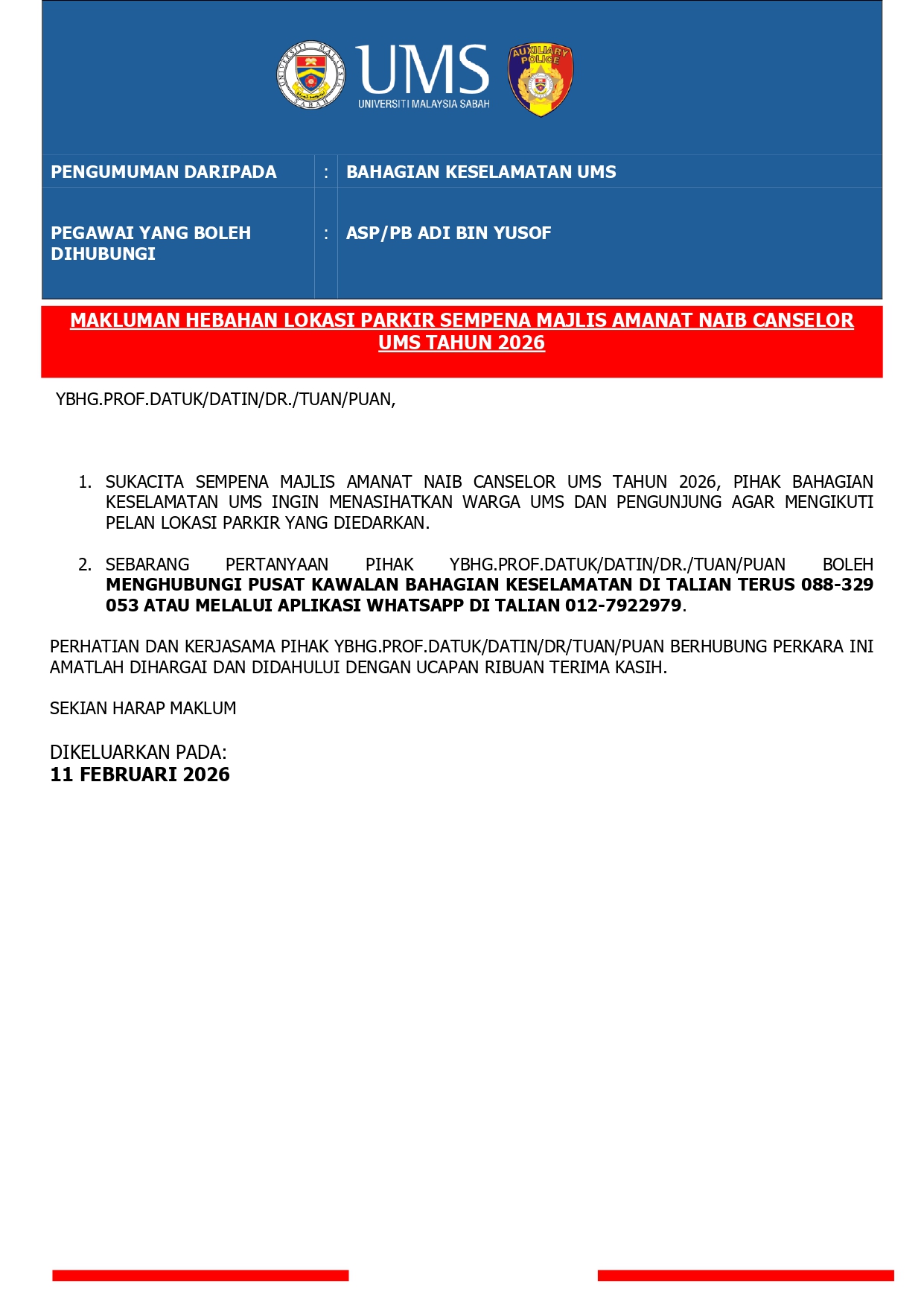 Pihak Jawatankuasa Kebajikan Mahasiswa Non Residen (JAKMAS NR) Sesi 2025/2026 sedang menjalankan satu tinjauan bagi menilai keperluan perkhidmatan van shuttle khusus untuk pelajar Non Residen Universiti Malaysia Sabah (UMS).