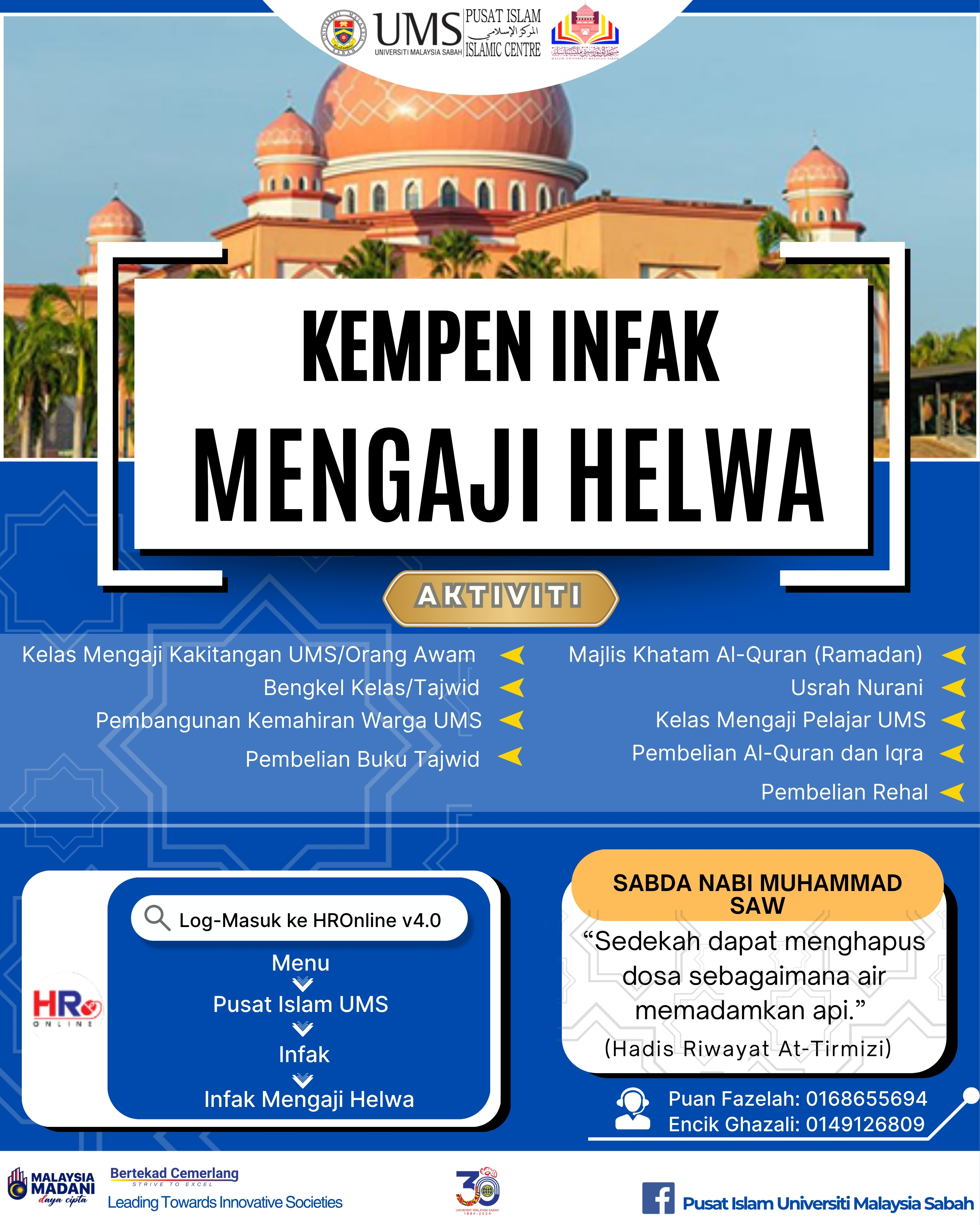Sukacita dimaklumkan bahawa Pusat Islam Universiti Malaysia Sabah (UMS) kini membuka peluang kepada warga universiti untuk menyertai program Infak HELWA melalui potongan gaji bulanan.