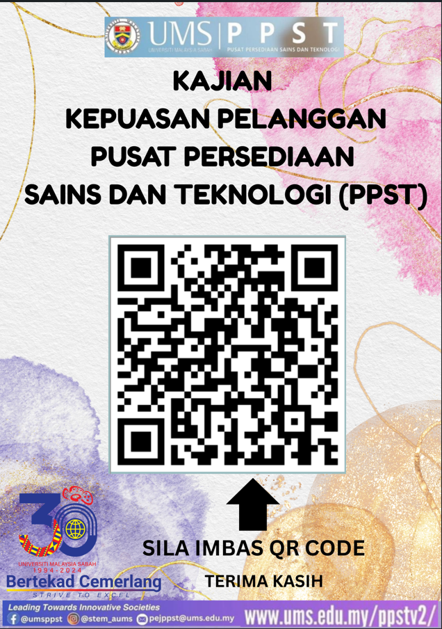 Adalah dimaklumkan bahawa Pihak Pusat Persediaan Sains dan Teknologi (PPST) amat mengalu-alukan aduan/komen dan cadangan semua warga UMS  mengenai mutu penyampaian perkhidmatan PPST dengan mengisi Kajian Kepuasan Pelanggan yang disediakan di pautan  https://eoffice.ums.edu.my/e-respon/kepuasan_pelanggan.php?id=104&key=PPST  atau mengimbas kod QR yang telah disediakan seperti dalam poster.