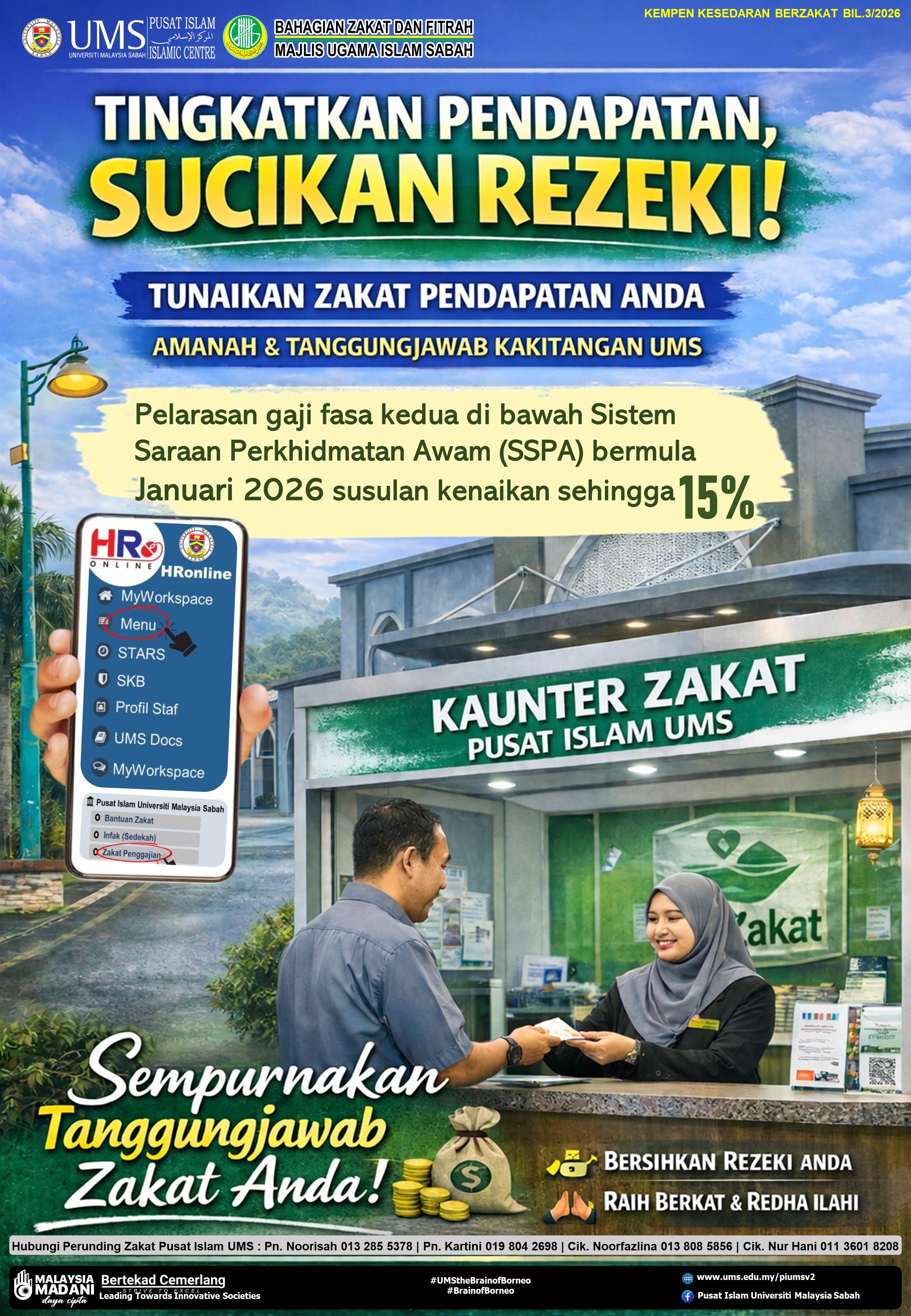 Seiring dengan pertambahan pendapatan hasil kenaikan gaji SSPA, penjawat awam kakitangan UMS disarankan membuat taksiran semula zakat pendapatan bagi memastikan kewajipan zakat ditunaikan berdasarkan kiraan sebenar selaras dengan gaji baharu/semasa.
