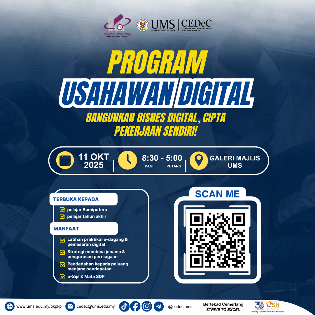 Jom sertai Program Usahawan Digital 2025 anjuran CEDeC UMS dengan kerjasama Yayasan Pelajaran MARA (YPM) di bawah Program Semarak Ilmu (PSI)!