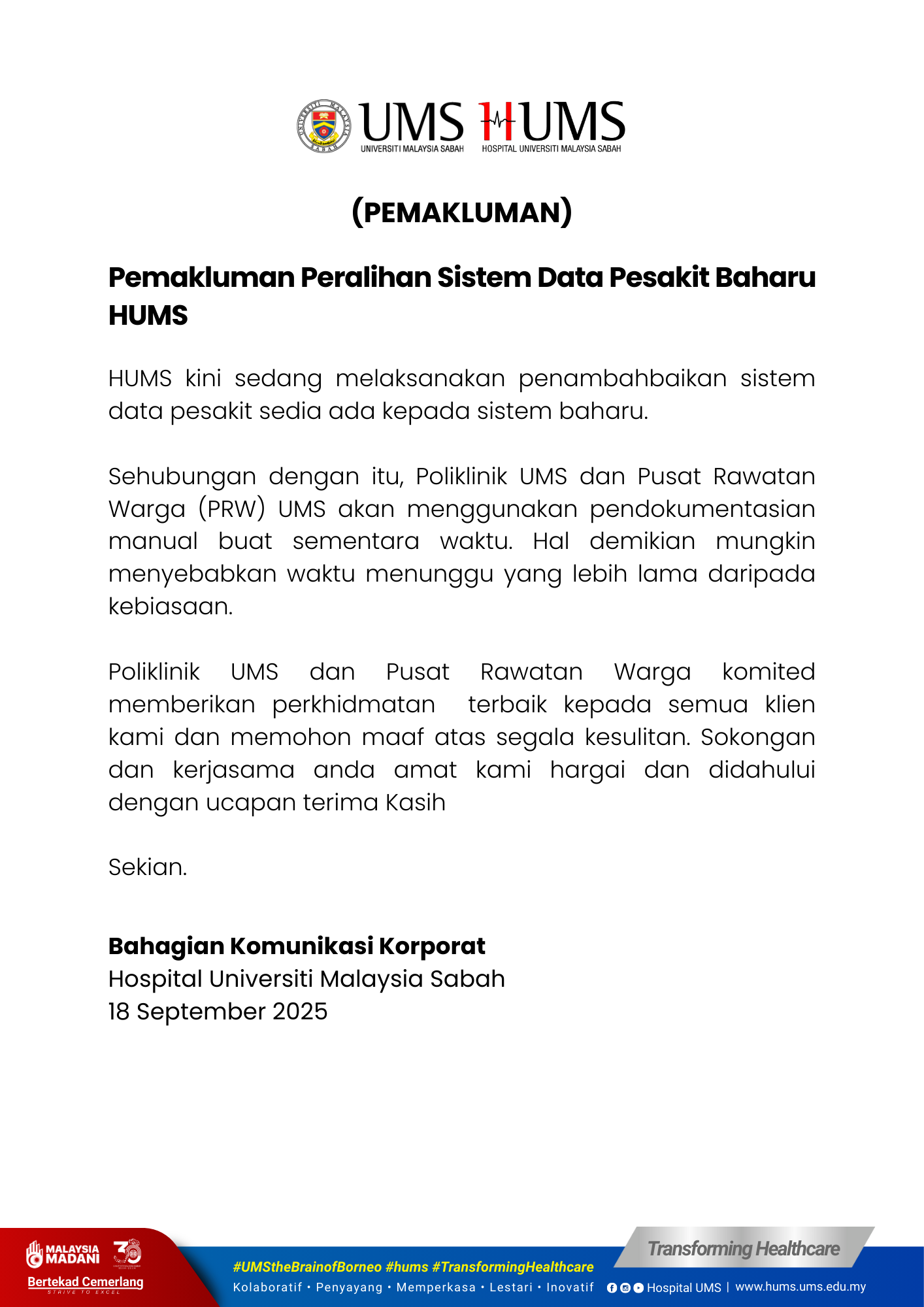 Pengumuman Daripada: Bahagian Komunikasi Korporat, Hospital UMS