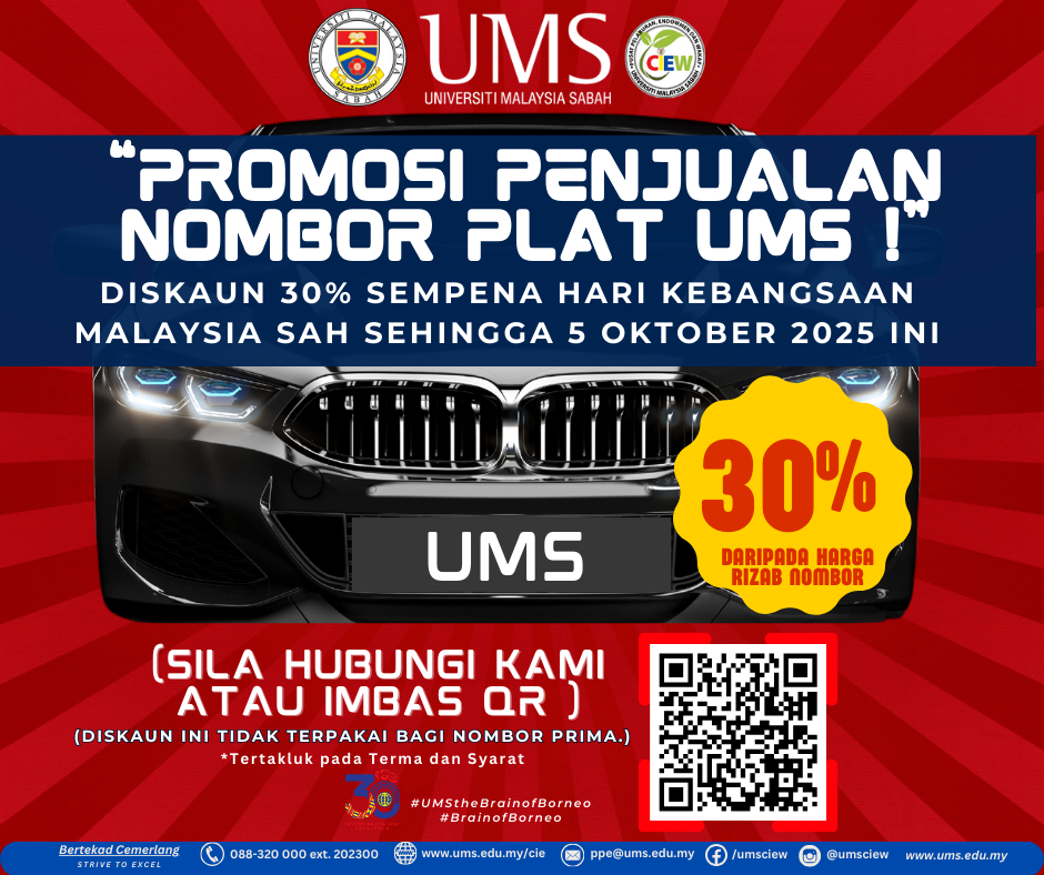 Pusat Pelaburan, Endowmen dan Wakaf (CIEW) mempelawa orang ramai untuk membeli Nombor Plat UMS dan berpeluang menikmati diskaun sebanyak 30% sempena Hari Kebangsaan Malaysia.