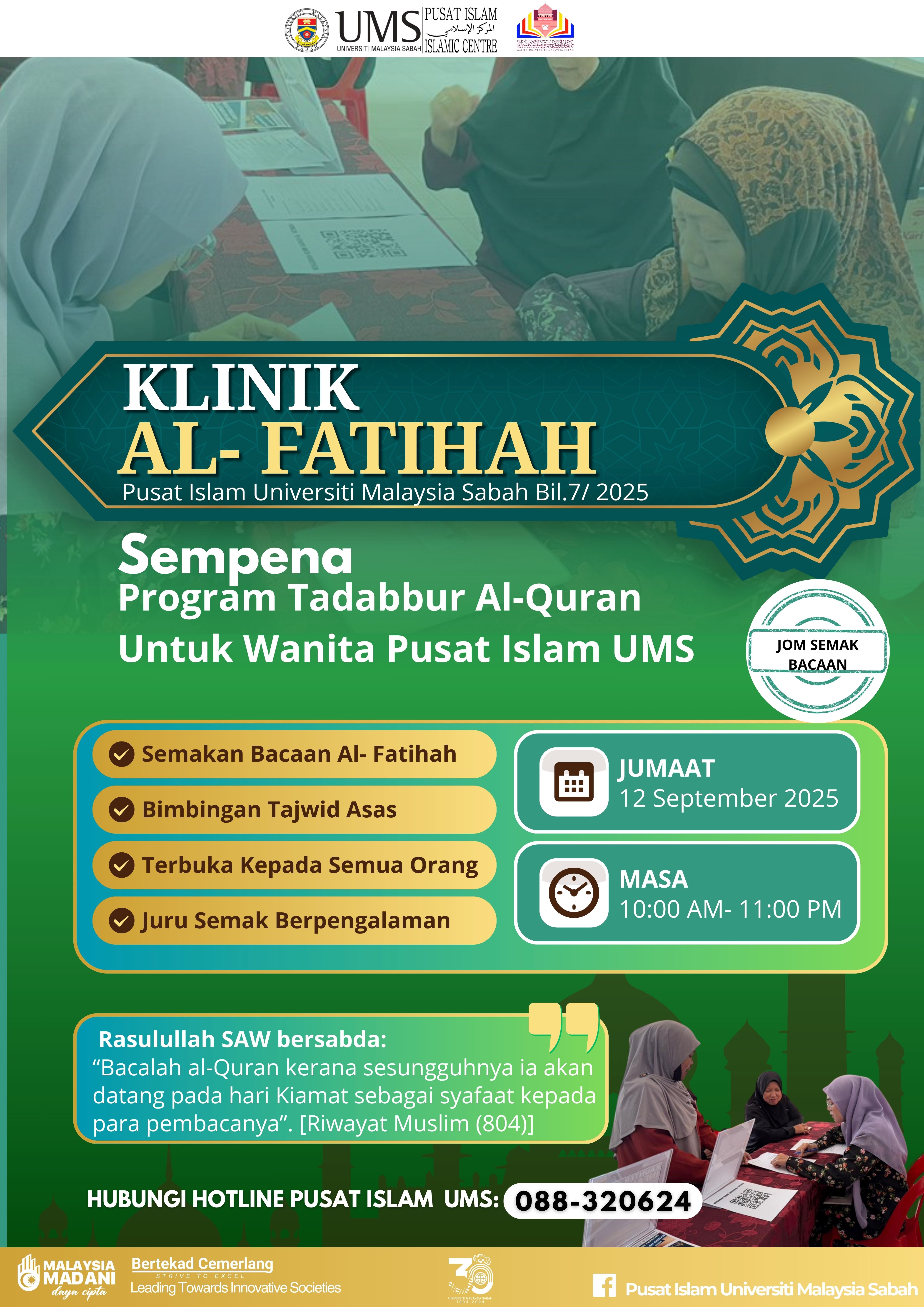 Sukacita dimaklumkan bahawa Pusat Islam mempelawa kepada yang berminat untuk membuat semakan bacaan Surah al- Fatihah di kaunter Klinik al- Fatihah Sempena Program Tadabbur Al-Quran Untuk Wanita Pusat Islam UMS pada ketetapan berikut: