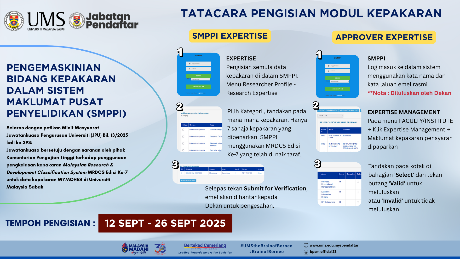 Tempoh pengisian dan pengemaskinian adalah mulai 12 September 2025 hingga 26 September 2025. Semua kakitangan akademik dimohon memastikan pengisian dibuat dalam tempoh yang ditetapkan.