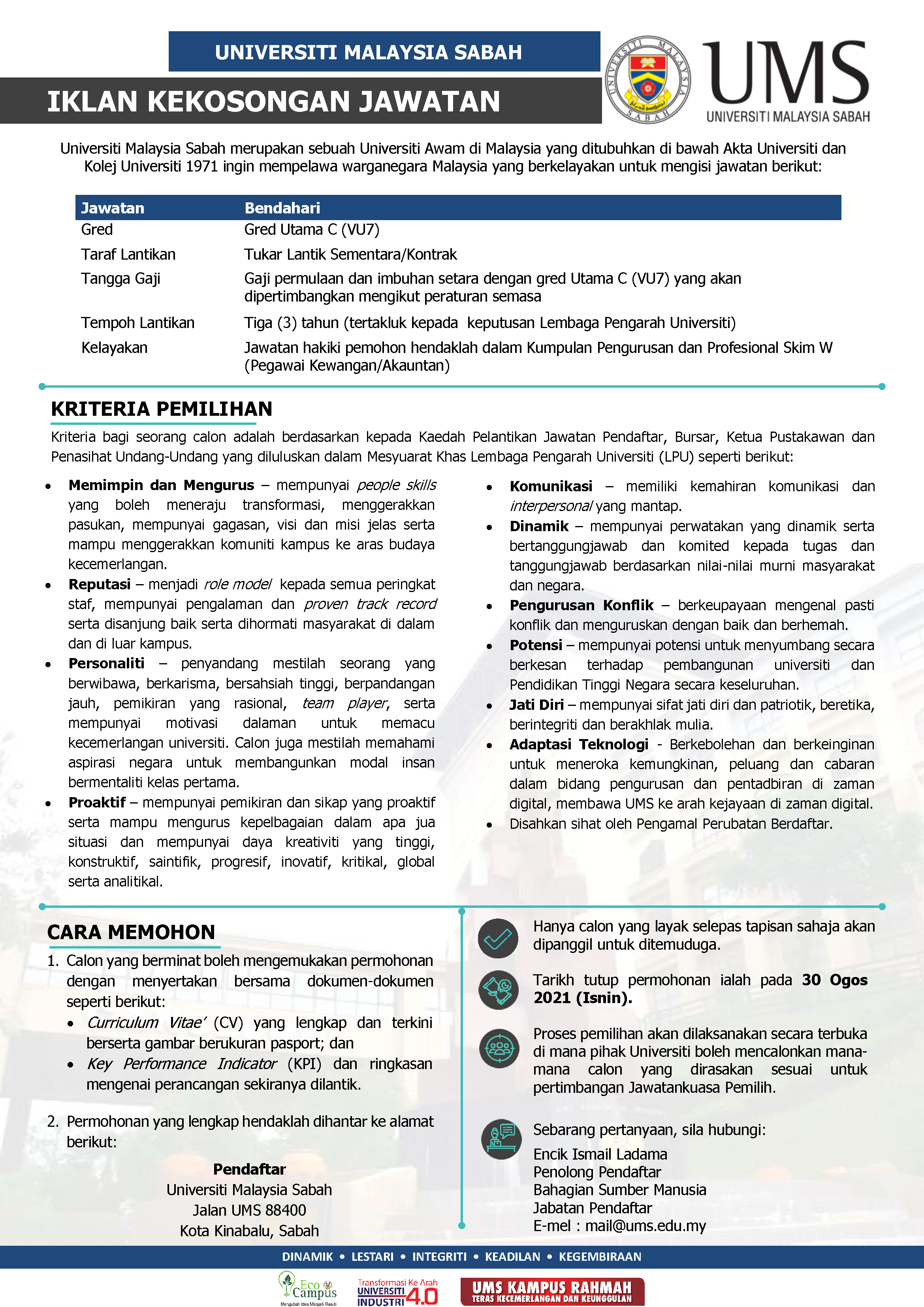 2. Adalah dimaklumkan, Universiti Malaysia Sabah (UMS) dengan ini mempelawa kakitangan yang berkelayakan dan berminat untuk mengisi jawatan Bendahari gred Utama C (VU7) di universiti ini.