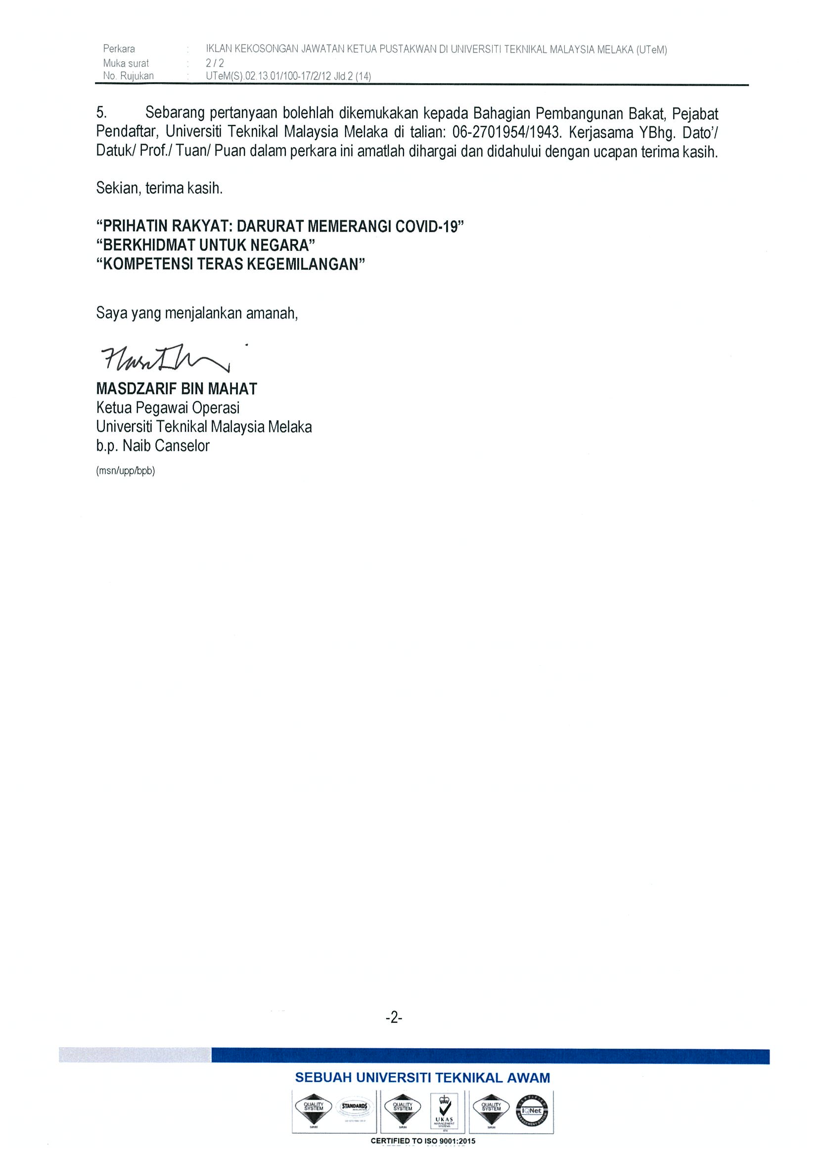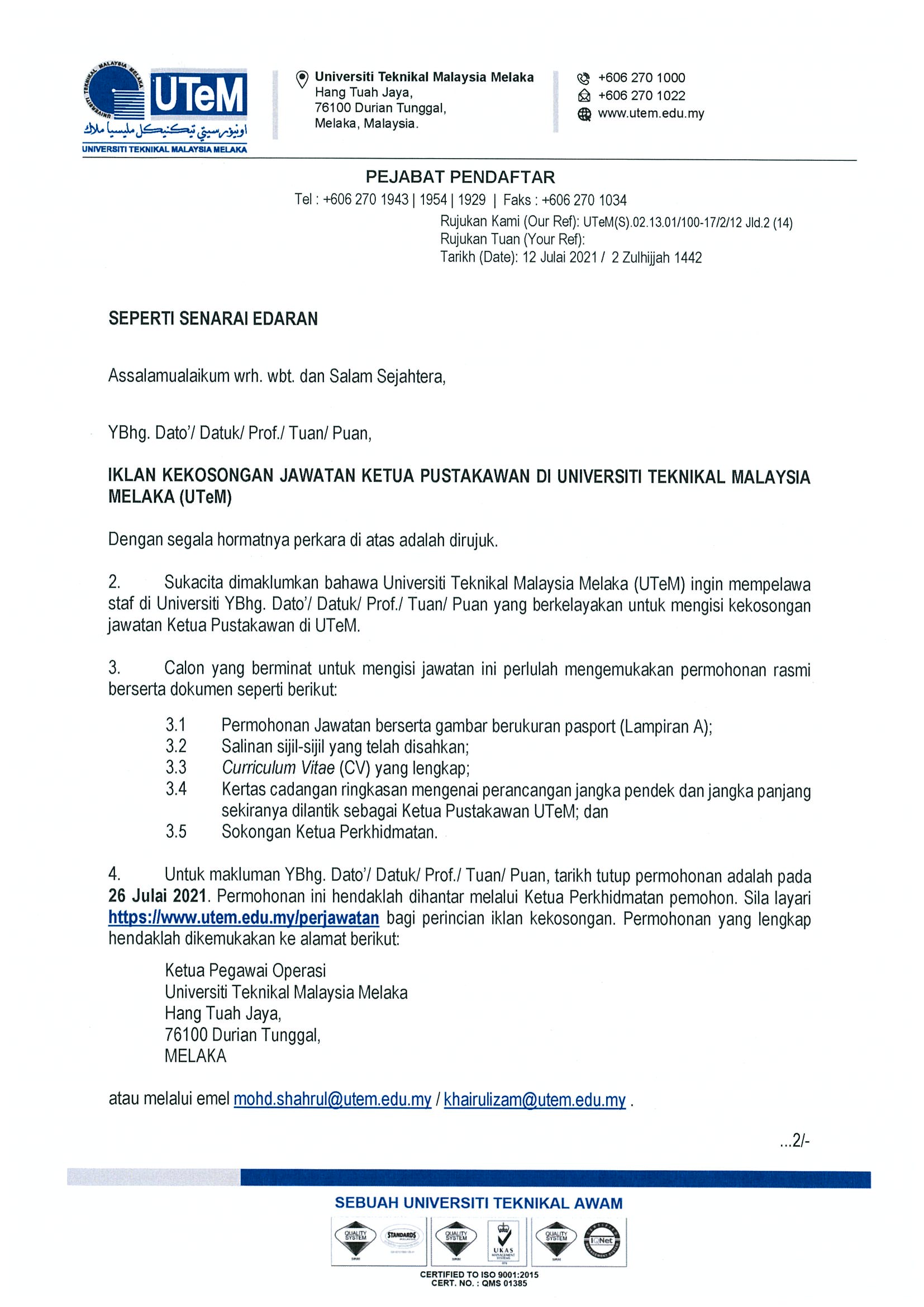 Iklan Kekosongan Jawatan Ketua Pustakawan Di Universiti Teknikal Malaysia Melaka (UTeM) (.pdf)