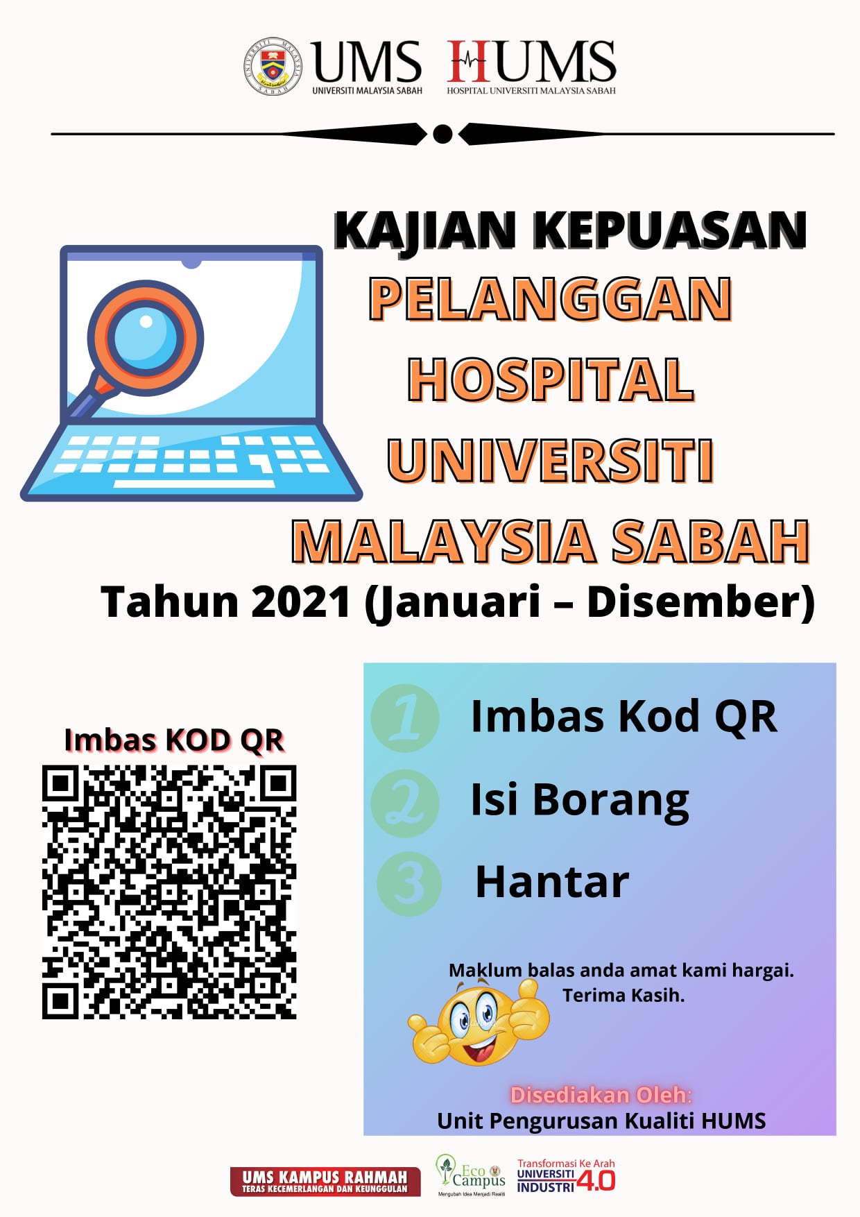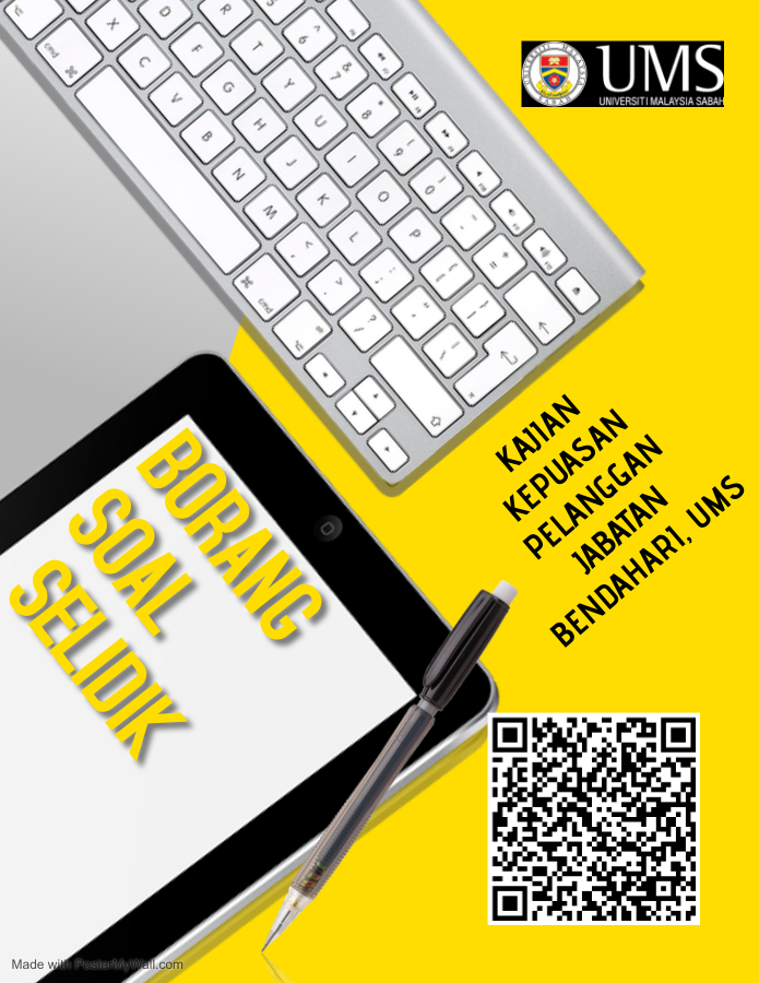 Terima kasih kerana berurusan dengan pihak Jabatan Bendahari, UMS. Bagi meningkatkan mutu perkhidmatan kami, mohon kerjasama YBhg. Datuk/Prof./Dr./Tuan/Puan agar dapat mengisi soal selidik kajian kepuasan pelanggan melalui pautan di bawah atau imbas kod QR tersebut: https://docs.google.com/forms/d/e/1FAIpQLSecyBWnhY2ZVdGnnUp643SZy0_tF9VmKHgXUH5PIIOZW5tqHA/viewform?usp=pp_url&entry.827648600=BN