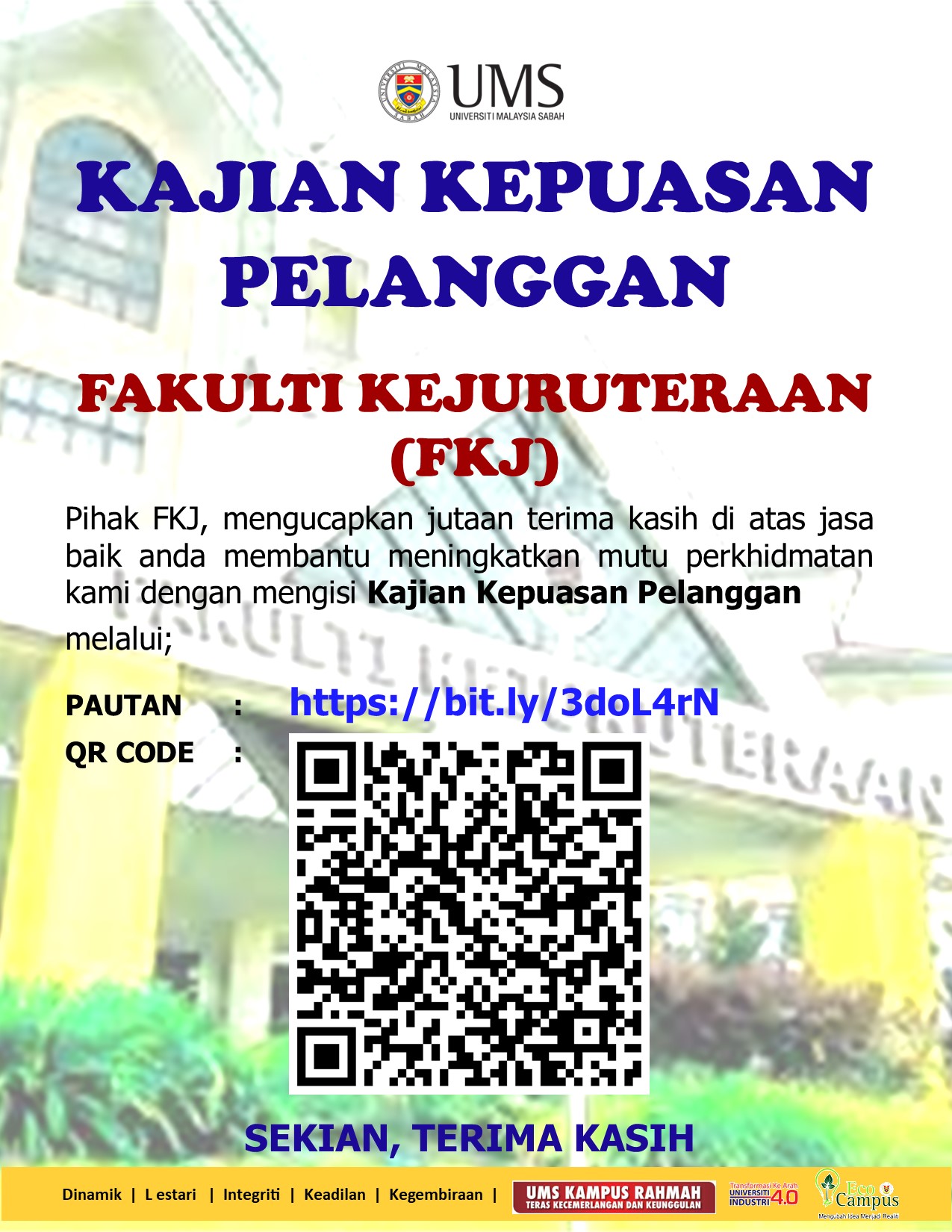 Bagi meningkatkan mutu perkhidmatan kami, mohon kerjasama YBhg. Datuk/Prof./Dr./Tuan/Puan agar dapat mengisi soal selidik kajian kepuasan pelanggan melalui pautan di bawah atau imbas kod QR yang dilampirkan: