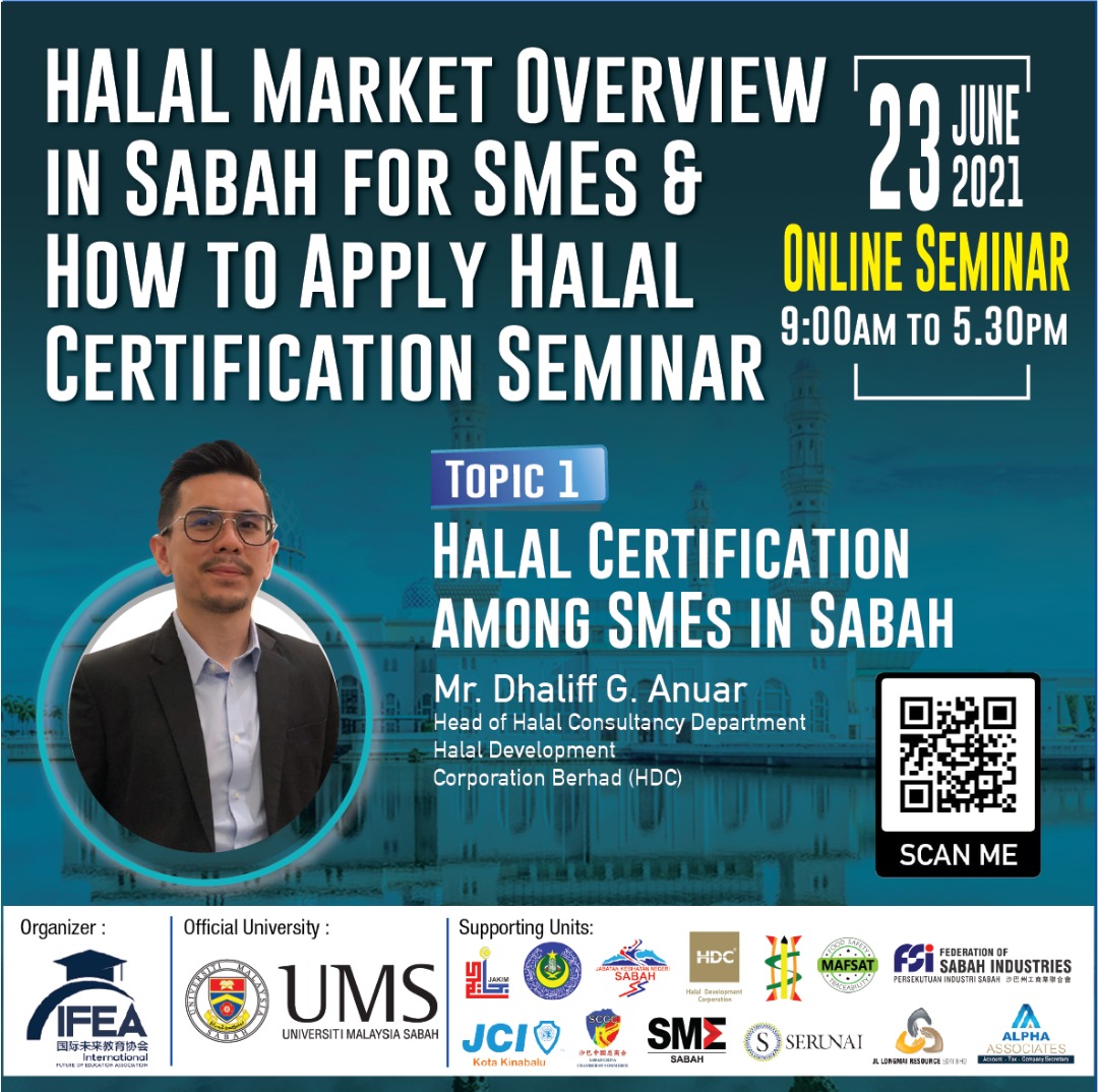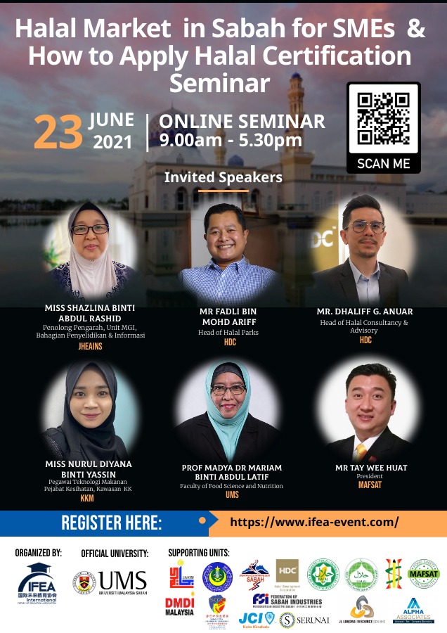 Sukacita dimaklumkan bahawa Universiti Malaysia Sabah (UMS) dengan kerjasama International Future of Education Association (IFEA) melalui Fakulti Sains Makanan dan Pemakanan (FSMP) akan menganjurkan Halal Market Overview in Sabah for SMEs & How to Apply Halal Certification Seminar (Online) pada 23 Jun 2021. Justeru, kepada sesiapa yang berminat boleh mendaftarkan penyertaan anda di https://www.ifea-event.com/ atau scan QR Code pada poster yang dilampirkan. Sekian, terima kasih.