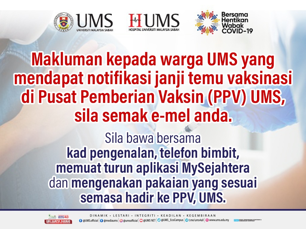 Kementerian Pengajian Tinggi (KPT) telah mengumumkan bahawa Universiti Malaysia Sabah (UMS) akan menjadi salah sebuah Pusat Pemberian Vaksin (PPV). Operasi PPV UMS akan bermula pada 14 Jun 2021 (Isnin) di Kompleks Dewan Kuliah Pusat ke-2 (DKP13 dan 14), UMS.