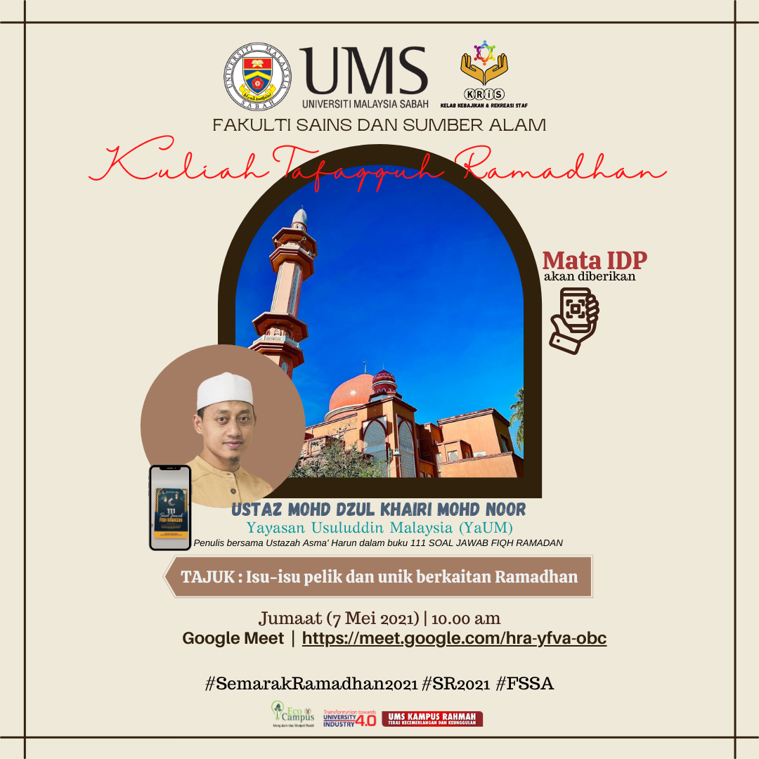 Pihak Kelab Kebajikan dan Rekreasi Staf (KRiS), Fakulti Sains dan Sumber Alam, Universiti Malaysia Sabah ingin mengalu-alukan warga kampus (terbuka kepada semua kakitangan mahupun pelajar) ke program Kuliah Tafaqquh Ramadhan secara VIRTUAL yang akan diadakan pada ketetapan berikut:-