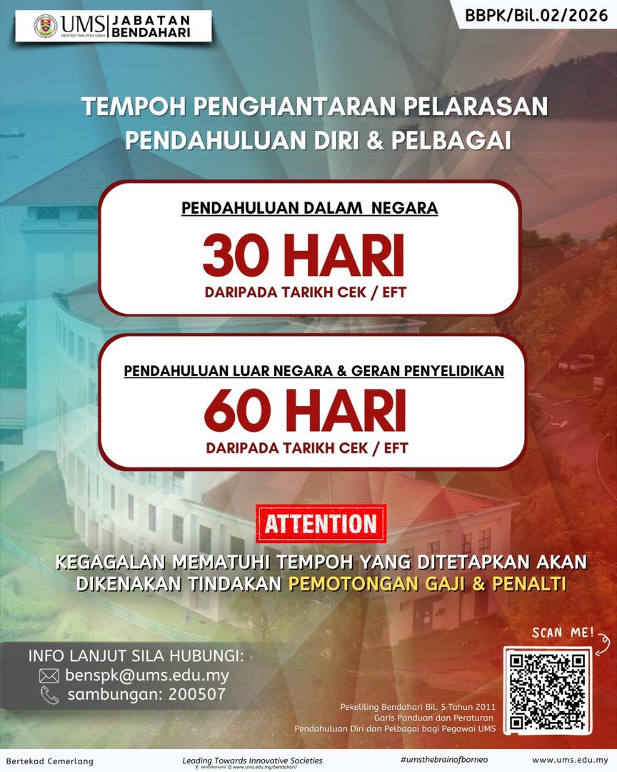 Garis Panduan, Borang Permohonan dan dokumen berkaitan boleh dicapai dengan melayari laman web Penerbit UMS atau melalui pengimbasan kod QR yang disediakan. Permohonan boleh dihantar ke Penerbit UMS, aras 2, Bangunan Pusat Pengajian Pascasiswazah, Isnin-Jumaat, 9.00 pagi - 4.00 petang.