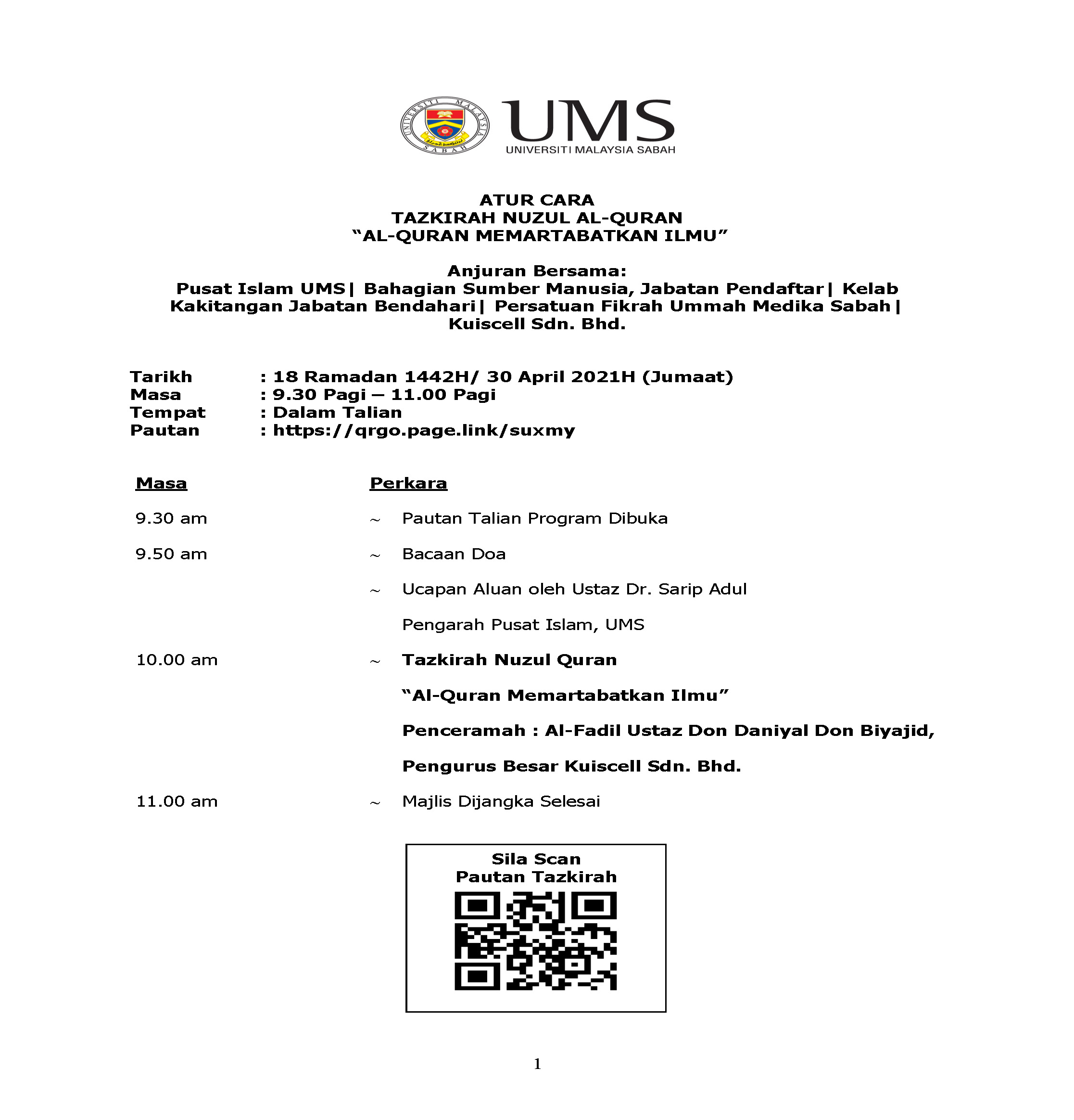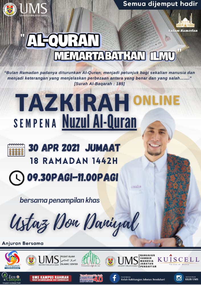 Sukacita dimaklumkan kepada pihak YBhg. Datuk./Prof./Dr./Tuan/Puan/Siswa-Siswi Universiti Malaysia Sabah, Universiti Malaysia Sabah anjuran bersama Kelab Kakitangan Jabatan Bendahari Universiti Malaysia Sabah, Pusat Islam Universiti Malaysia Sabah, Bahagian Sumber Manusia Universiti Malaysia Sabah dan Persatuan Fikrah Ummah Medika Sabah ingin mempelawa pihak YBhg. Datuk./Prof./Dr./Tuan/Puan/Siswa-Siswi Universiti Malaysia Sabah untuk menghadiri Tazkirah yang akan di adakan secara atas talian bersempena Nuzul Al-Quran di bulan Ramadan pada tahun ini yang akan dijalankan secara atas talian seperti ketetapan berikut :