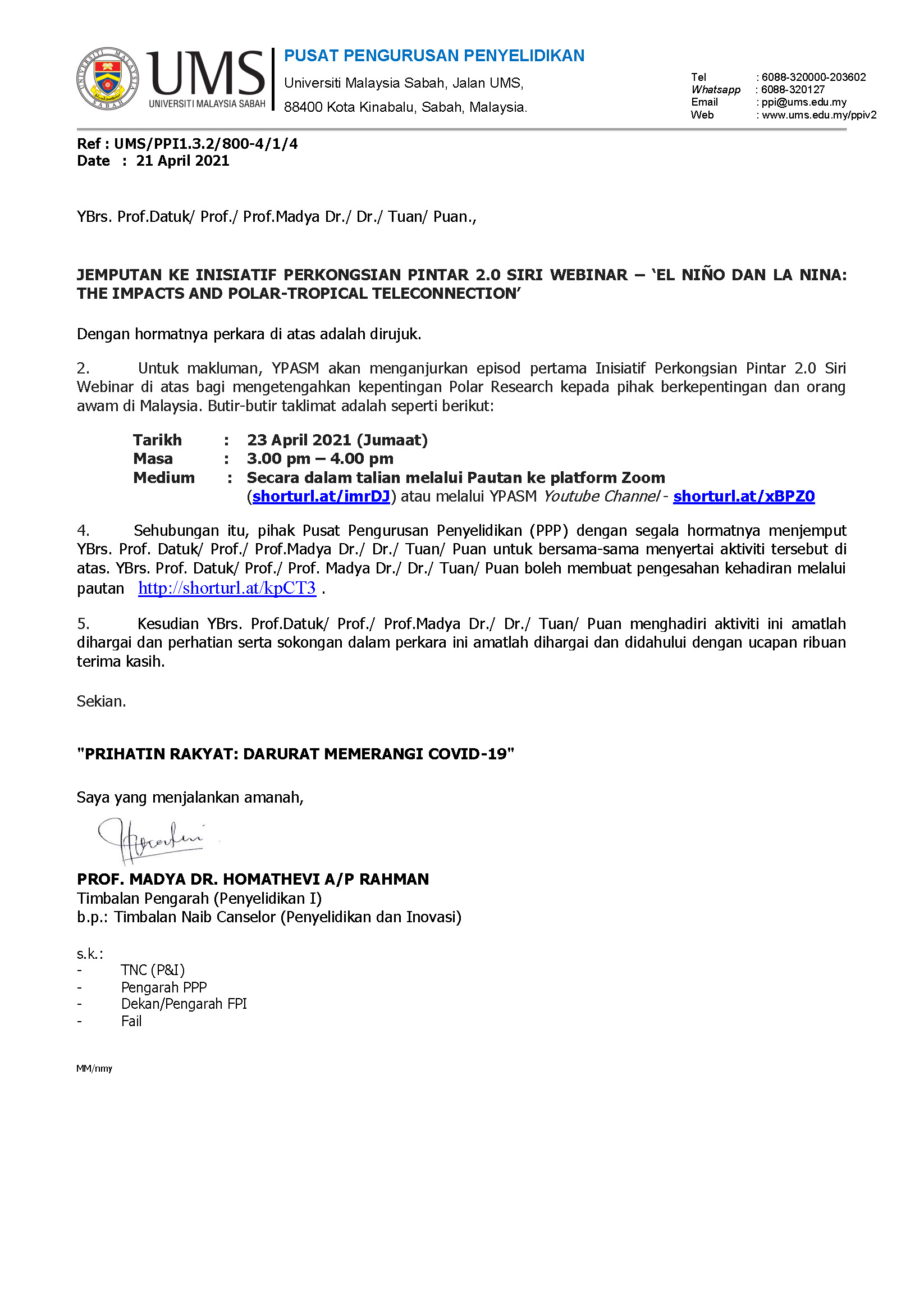 Jemputan Ke Inisiatif Perkongsian Pintar 2.0 Siri Webinar – ‘El Niño Dan La Nina: The Impacts And Polar-Tropical Teleconnection’