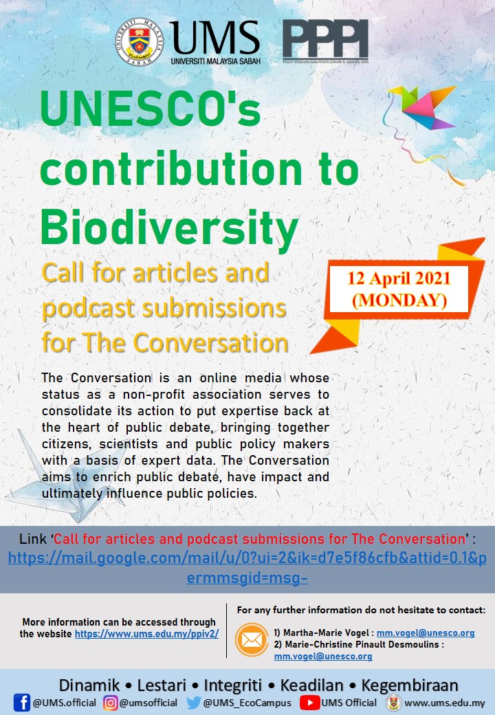 2. Sukacita dimaklumkan bahawa Sekretariat MAB UNESCO telah bekerjasama bersama The Conversation France ingin menjemput individu-individu yang berminat untuk menghantar podcast dan artikel khususnya yang berkaitan dengan bidang biodiversiti untuk dimuat naik dalam platform tersebut.
