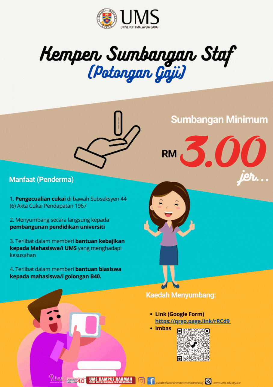 Dimaklumkan bahawa UMS melalui Pusat Pelaburan, Endowmen dan Wakaf (CIEW) mengadakan kempen sumbangan staf ke Tabung-Tabung Amanah UMS (Endowmen dan Wakaf) melalui potongan gaji dengan sumbangan minimum RM3.00 sebulan.  Sumbangan akan digunakan untuk membantu pelajar UMS yang kurang berkemampuan dan amat memerlukan bantuan kewangan. Selain itu, sumbangan juga akan digunakan selaras dengan TOR Tabung-Tabung Amanah UMS yang mana sekaligus membantu dalam pembangunan pendidikan Universiti.