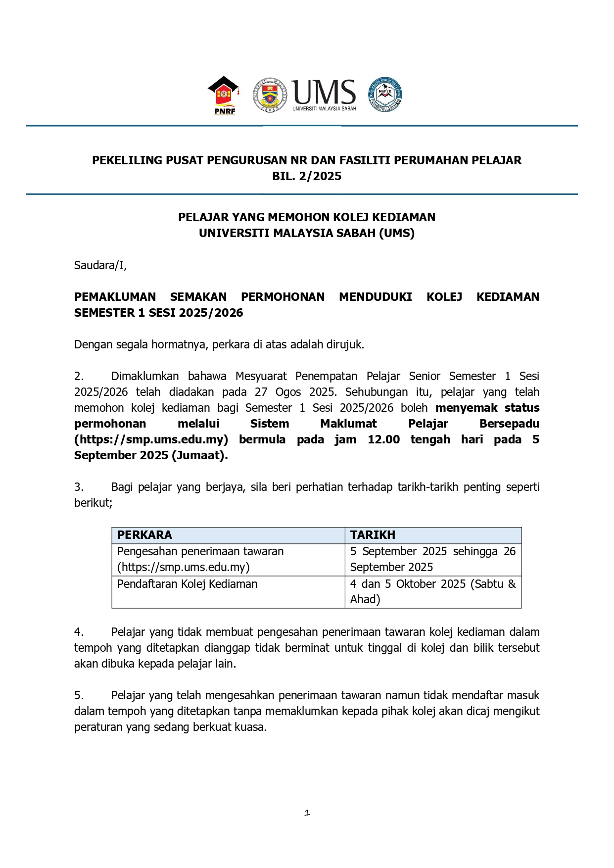 Pengumuman Daripada: Pusat Pengurusan NR dan Fasiliti Perumahan Pelajar