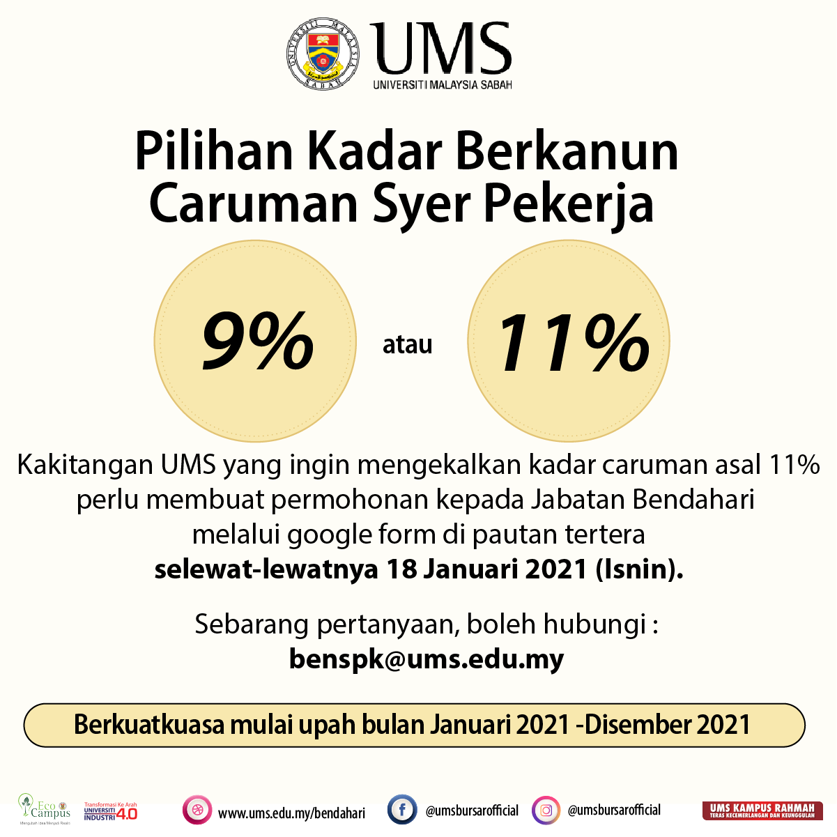 Sehubungan itu, kakitangan UMS yang merupakan ahli KWSP dan memilih untuk mengekalkan caruman kadar syer pekerja pada kadar 11% mulai gaji bulan Januari 2021 hendaklah melengkapkan google form seperti pautan berikut;