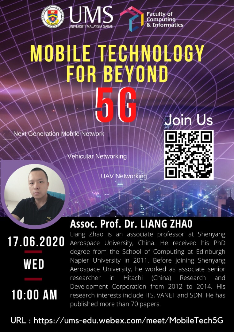 Sukacita semua pensyarah dan staf UMS adalah dijemput untuk menyertai sesi webinar bertajuk "Mobile Technology for Beyond 5G" yang akan disampaikan oleh Assoc. Prof. Dr. Zhang Liang dari Shenyang Aerospace University pada ketetapan berikut: