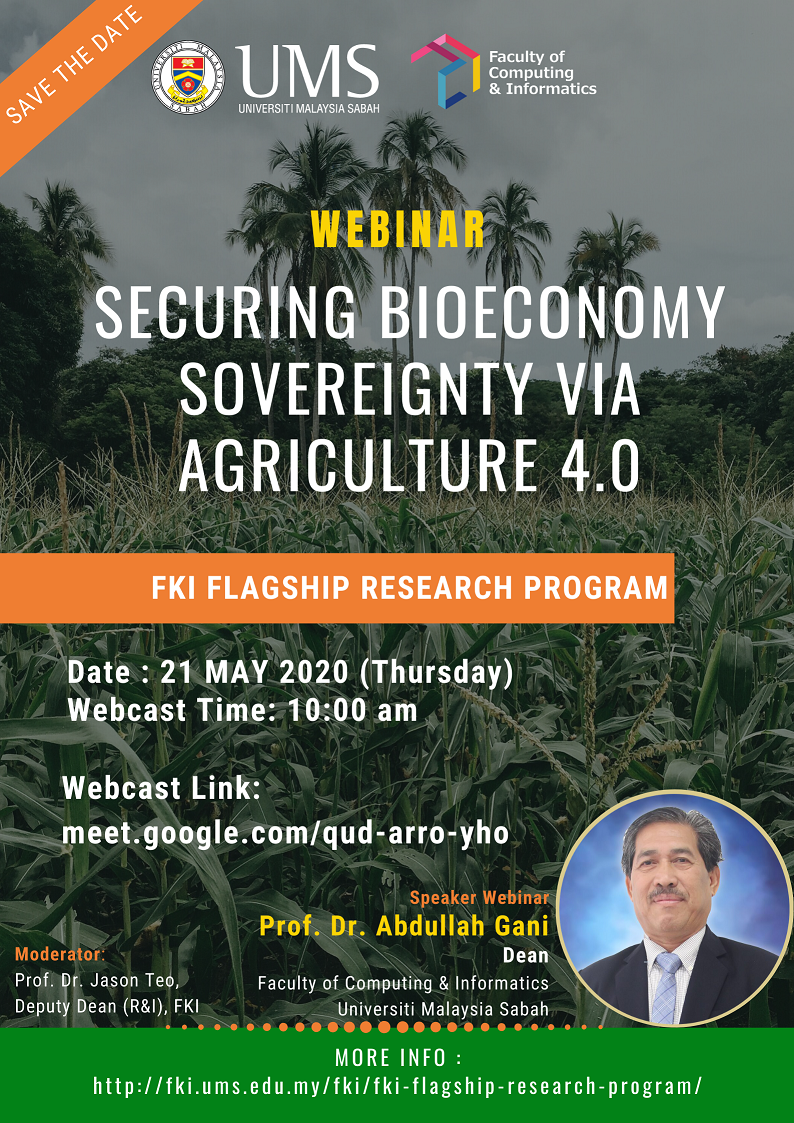 Sukacita semua pensyarah UMS dijemput untuk menyertai sesi WEBINAR berkenaan FKI Flagship Research Program (“Securing Bioeconomy Sovereignty via Agriculture 4.0”) yang akan diadakan pada ketetapan berikut: