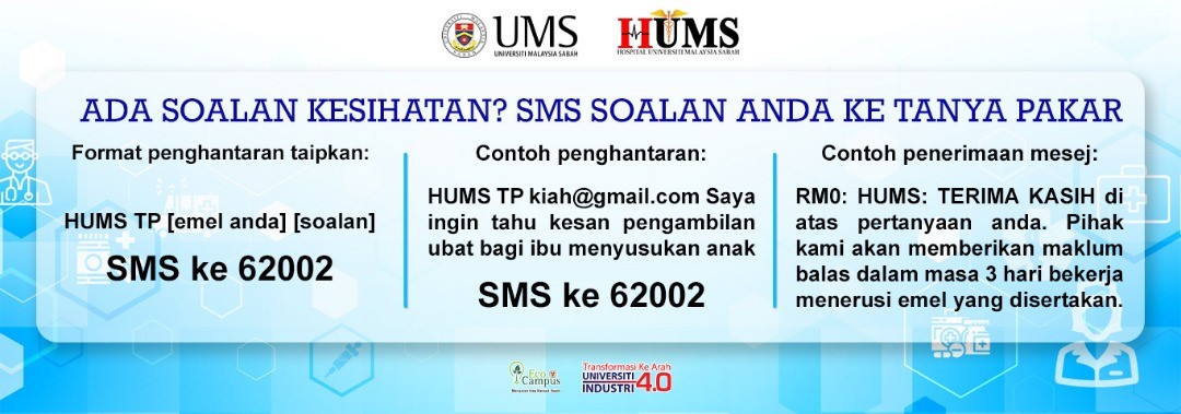 Selamat pagi dan salam sejathera Warga UMS. Sukacitanya dimaklumkan pihak HUMS telah menyediakan perkhidmatan Tanya Pakar Perubatan UMS melalui Pesan Ringkas (SMS) seperti dibawah.