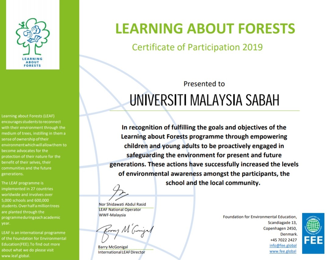 Subjek: Pengiktirafan 'Certificate of Participation 2019 - Learning About Forests (LEAF) Programme dari Foundation for Environmental Education (FEE) Denmark kepada Pusat Pengurusan EcoCampus UMS