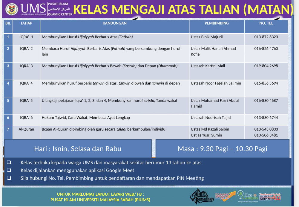 Sukacita dimaklumkan bahawa Pusat Islam akan mengadakan Kelas Mengaji Atas Talian (MATAN) sepanjang tempoh Perintah Kawalan Pergerakan