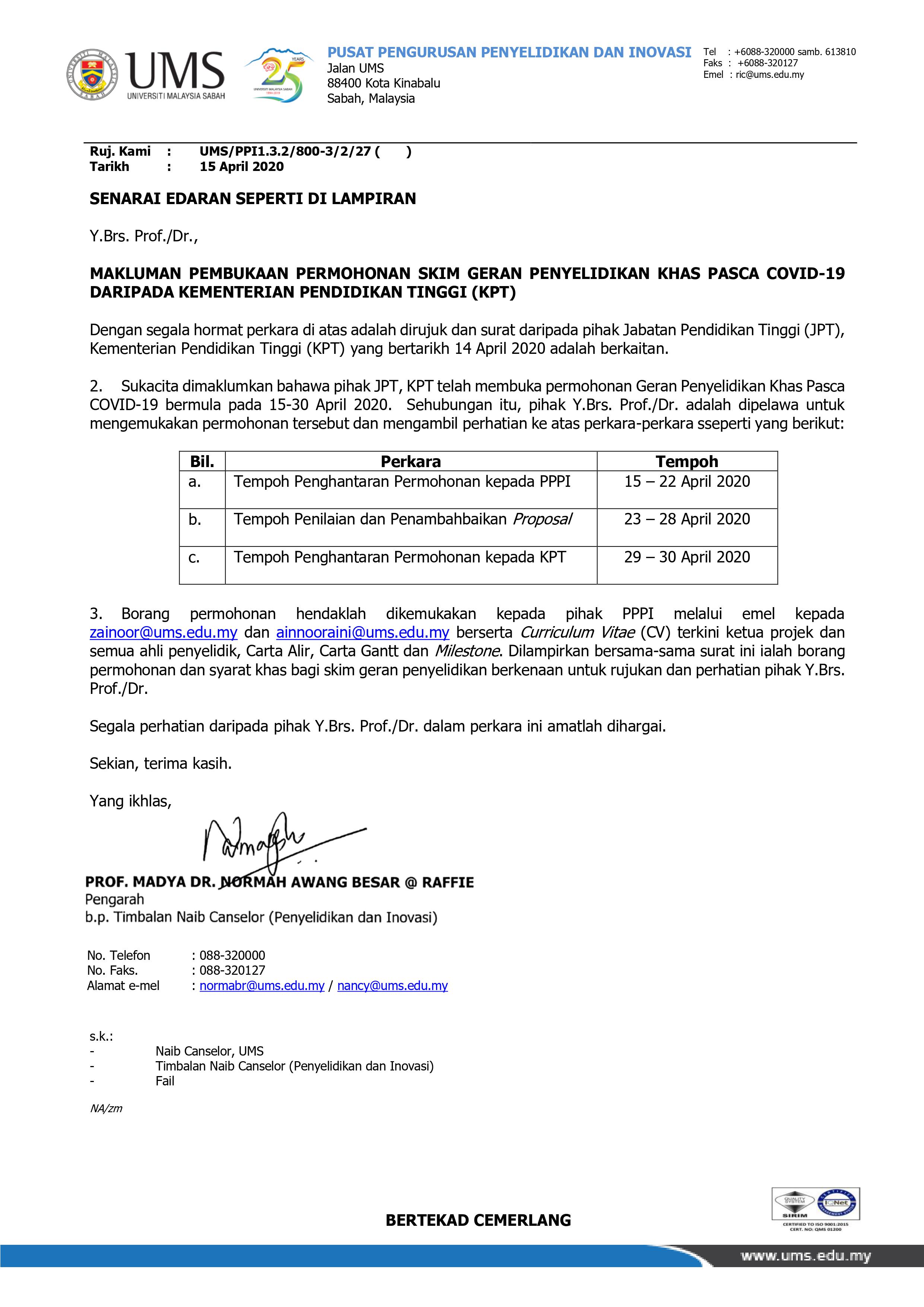 Maklumbalas hendaklah dikemukakan selewat-lewatnya pada hari selasa,  14 April 2020.  Sebarang pertanyaan berhubung dengan perkara ini boleh dimajukan melalui e-mel  ke alamat : Alamat emel ini dilindungi dari Spambot. Anda perlu hidupkan JavaScript untuk melihatnya..