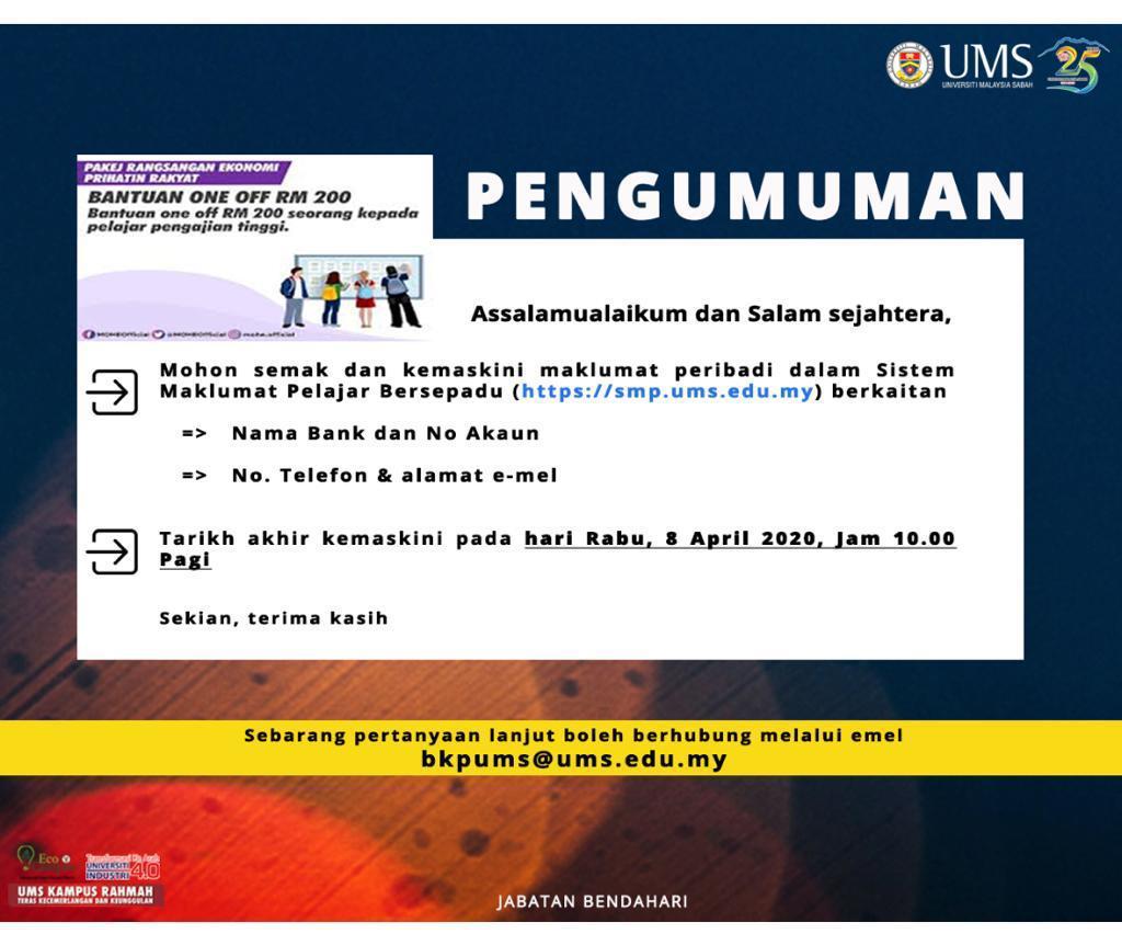 Pelajar yang gagal mengemaskini maklumat berkaitan akan mengakibatkan Bantuan One-Off RM200 ini tidak dapat dikreditkan ke dalam akaun bank pelajar.
