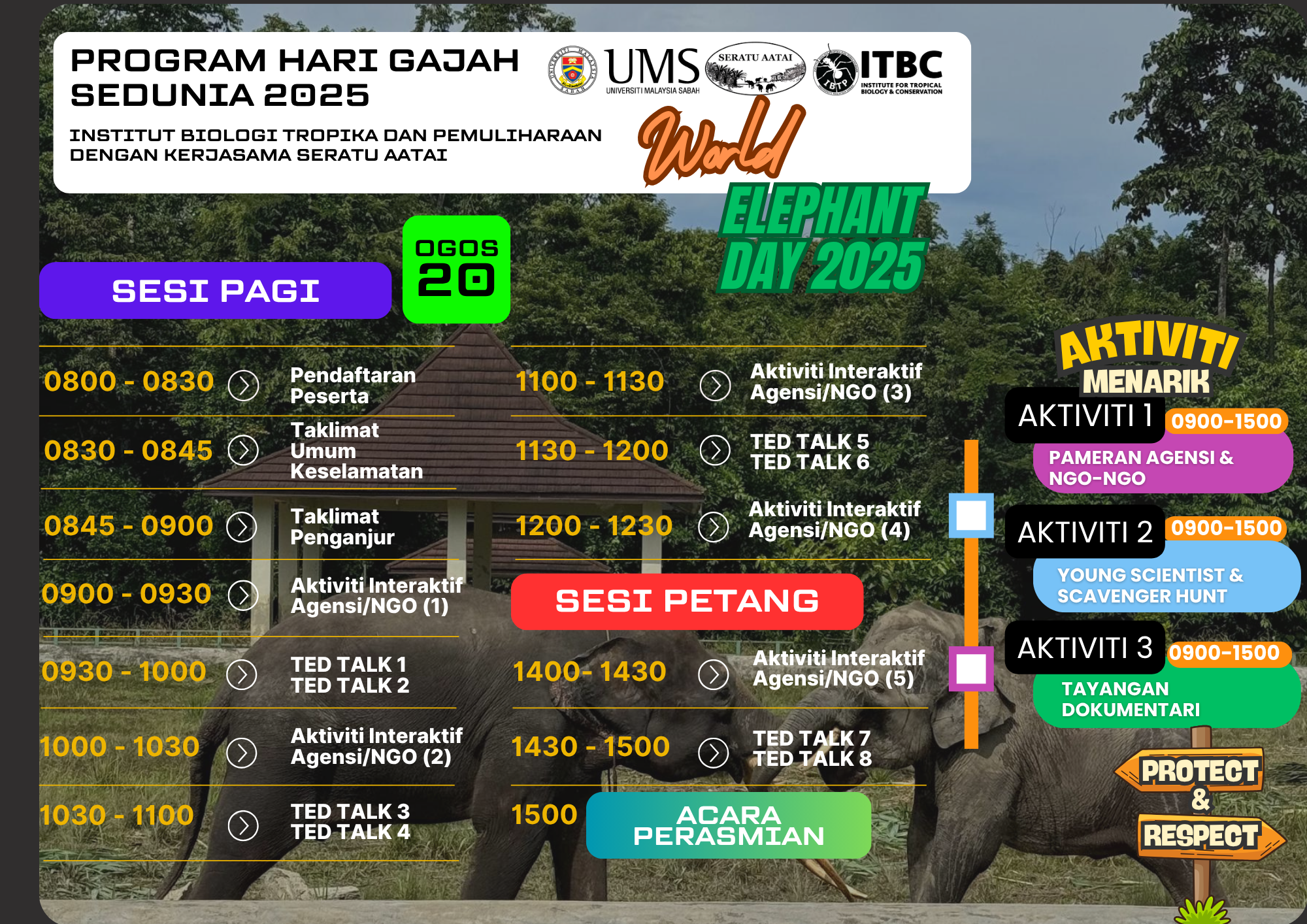 Sukacitanya dimaklumkan bahawa pihak Institut Biologi Tropika dan Pemuliharaan (IBTP), Universiti Malaysia Sabah dengan kerjasama Pertubuhan Pemuliharaan Biodiversiti Sabah Seratu Aatai (Seratu Aatai) akan menganjurkan program Hari Gajah Sedunia Peringkat UMS - “Protect and Respect”.