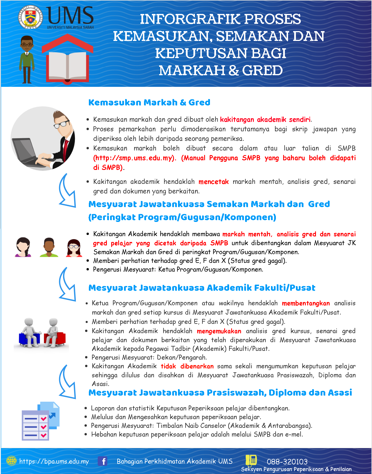 1. Sukacita dimaklumkan bahawa seksyen pengurusan peperiksaan dan penilaian, bahagian perkhidmatan akademik telah memuatnaik manual pengguna smpb (peratusan markah, kemasukan markah, penentuan gred dan analisis gred & markah) yang baharu di manual pengguna (manual peperiksaan), sistem maklumat pelajar bersepadu (http://smp.ums.edu.my).