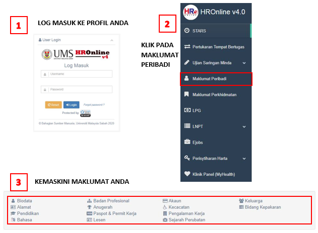 - Sehubungan itu, semua kakitangan Universiti Malaysia Sabah (UMS) dikehendaki untuk mengemaskini MAKLUMAT PERIBADIdi dalam sistem HROnline v4.0 selewat-lewatnya pada 15 Januari 2020 (Rabu). Sila klik pada pautan url https://registrar.ums.edu.my bagi mengemaskini maklumat ini dan rujuk panduan di bawah untuk langkah pengemaskinian:
