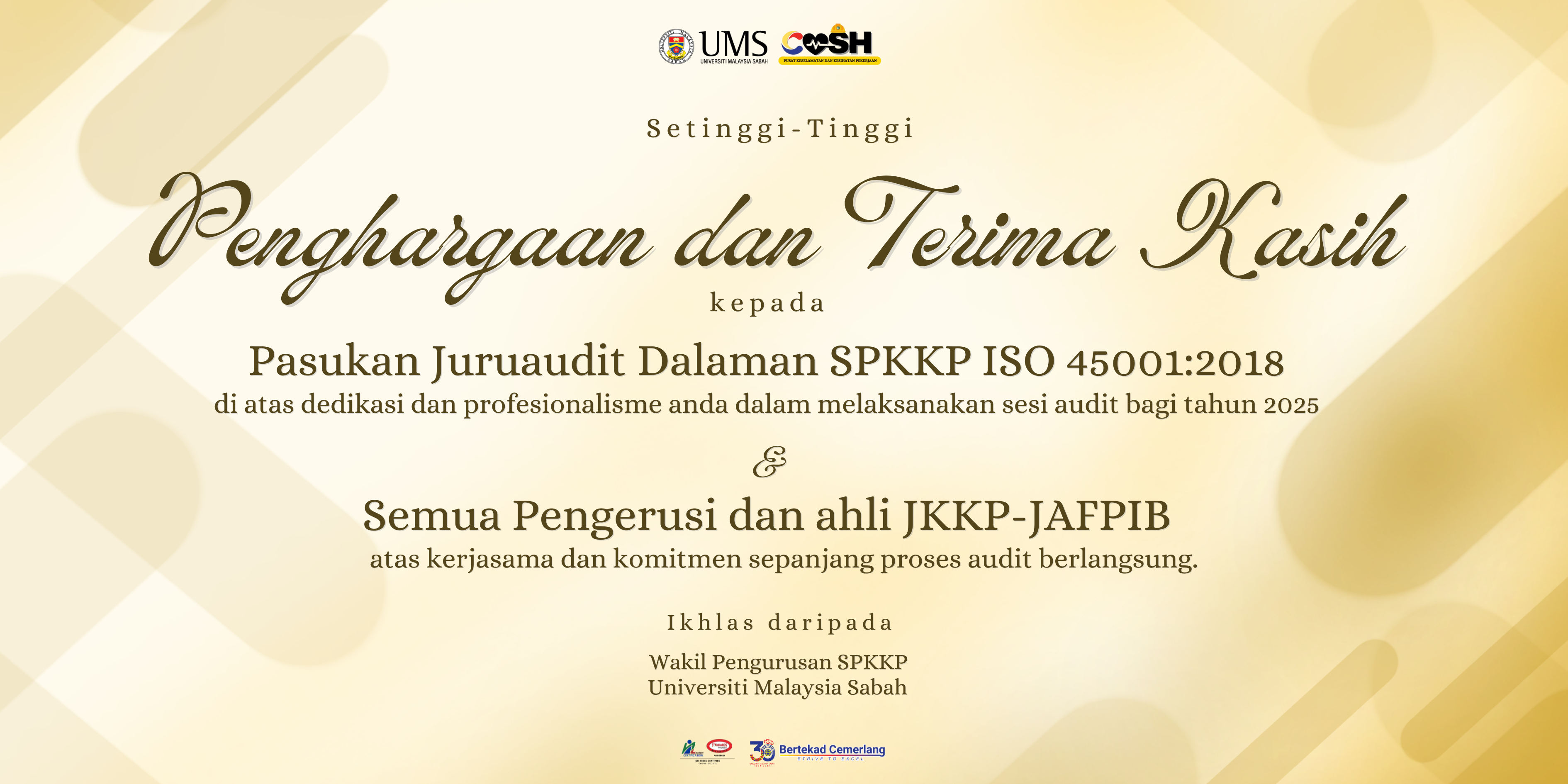 Ucapan Penghargaan dan Terima Kasih Kepada Pasukan Juruaudit Dalaman SPKKP ISO 45001:2018