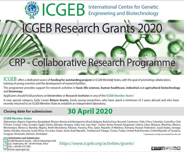 Pelawaan Untuk Permohonan Collaborative Research Program (CRP) Di Bawah International Centre For Genetic Engineering and Biotechnology (ICGEB) Research Grants 2020
