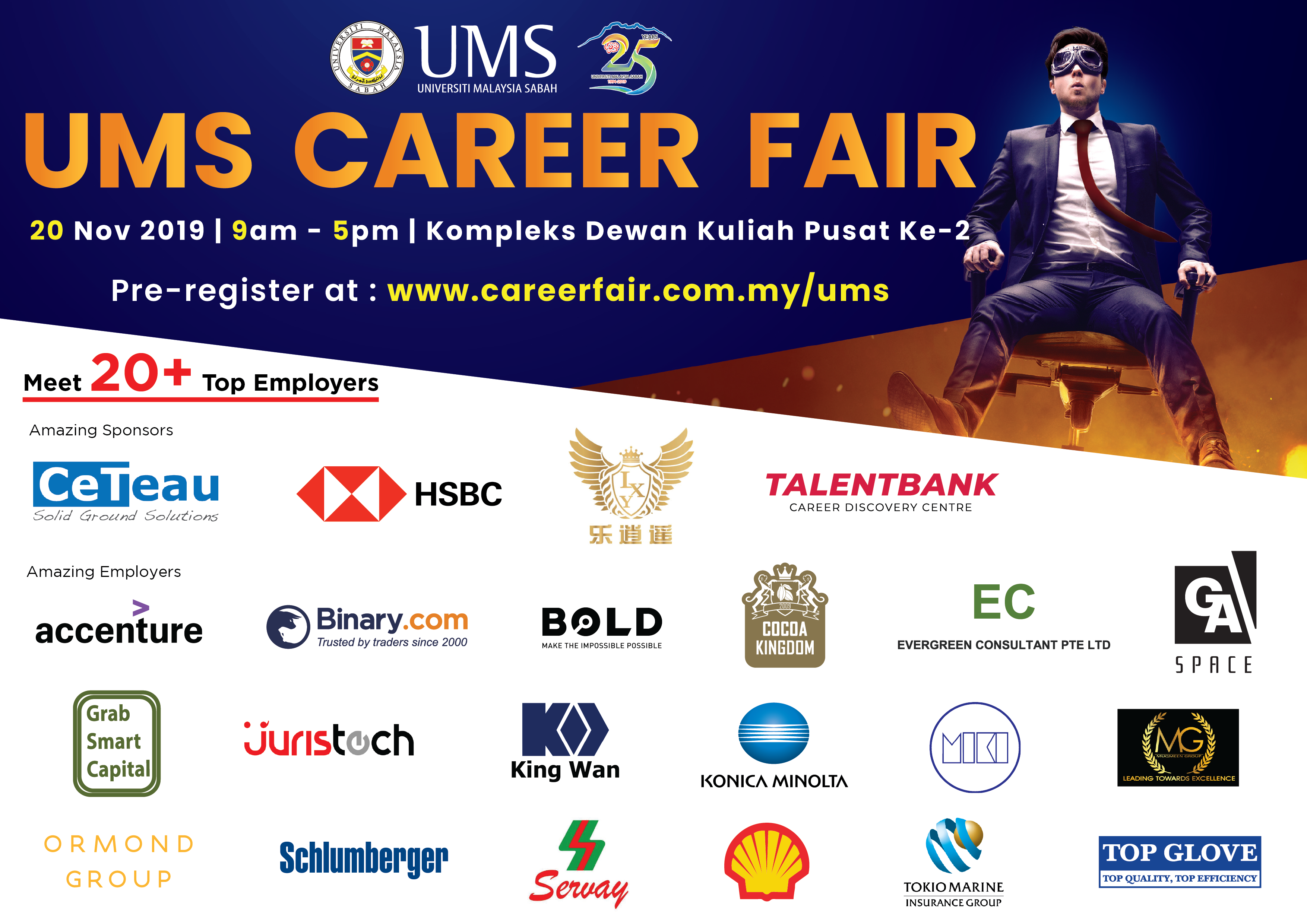 Sukacita dimaklumkan, Pusat Kerjaya dan Alumni, Universiti Malaysia Sabah dengan kerjasama TalentBank akan mengadakan UMS Career Fair 2019 yang akan berlangsung pada 20 November 2019 (Rabu) bertempat di DKP-21, Kompleks Dewan Kuliah Pusat Ke-2, UMS. Sehubungan dengan itu, semua warga kampus adalah dijemput hadir  terutama sekali graduan dan alumni UMS. Dilampirkan bersama poster hebahan dan aktiviti sepanjang program berlangsung.