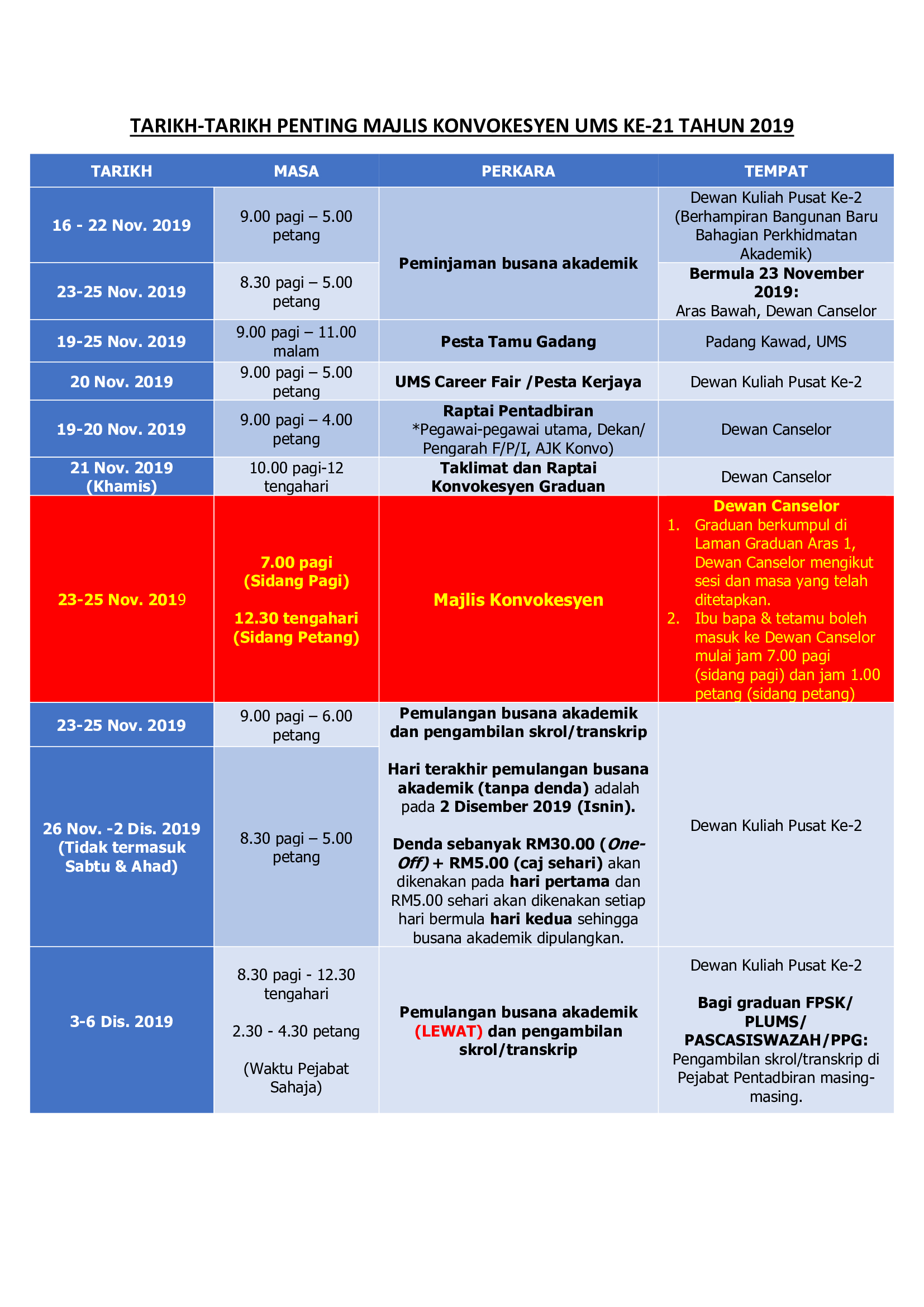 Subjek: Tarikh-Tarikh Penting Majlis Konvokesyen UMS Ke-21 Tahun 2019
