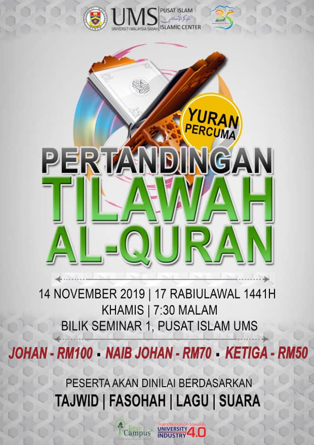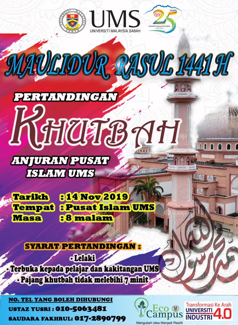- Sukacita dimaklumkan bahawa JawatanKuasa Ihtifal dan Musabaqah akan mengadakan pertandingan Tilawah Al-Quran dan Khutbah sempena Sambutan Maulidur Rasul SAW peringkat UMS 1441H/2019M.