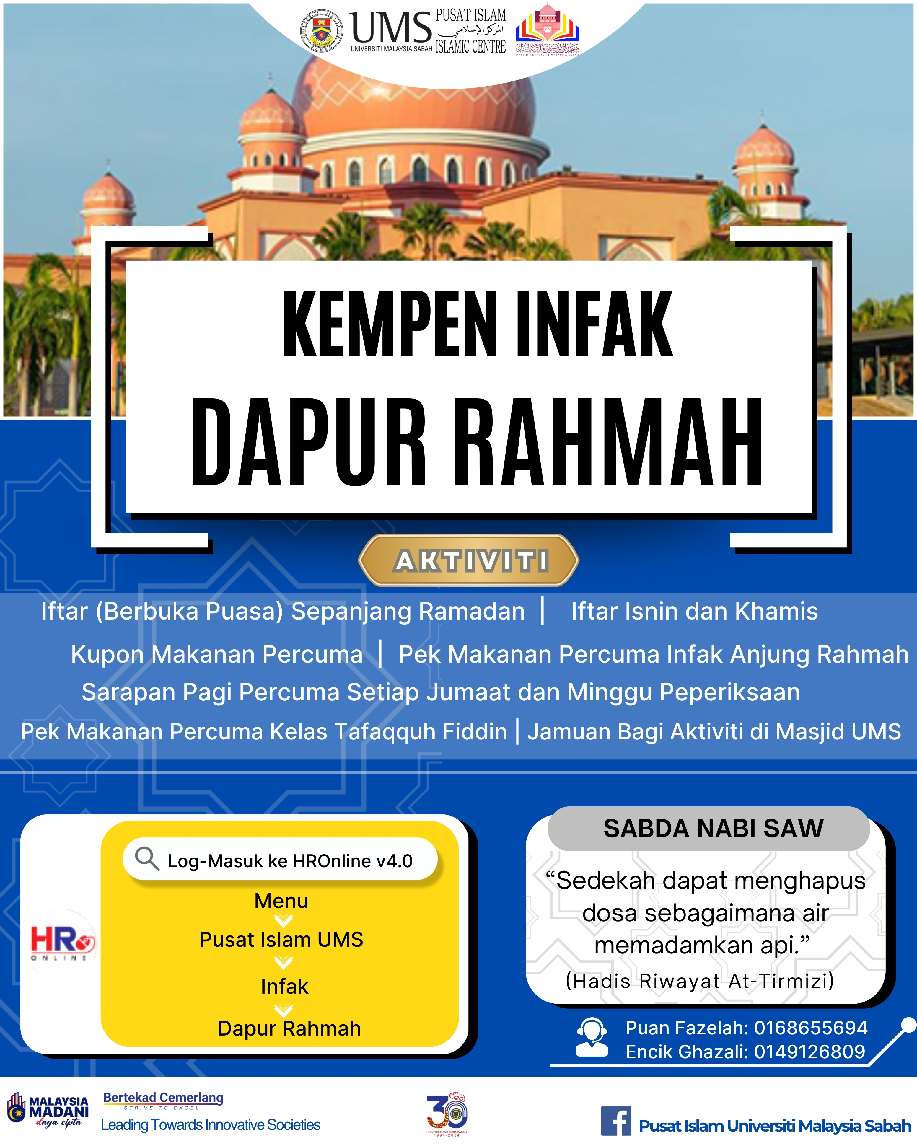 Sukacitanya, pihak PIUMS membuka penyertaan Infaq Dapur Rahmah (secara potongan gaji bulanan) kepada semua bagi membantu Jemaah masjid khususnya mahasiswa Universiti Malaysia Sabah yang kurang berkemampuan. Sumbangan ini juga digunakan untuk Program Iftar (Berbuka Puasa) Sepanjang Bulan Ramadan, Iftar (Berbuka Puasa) Isnin dan Khamis, Kupon Makanan Percuma, Pek Makanan Percuma Infaq Anjung Rahmah, Pek Makanan Percuma Kelas Tafaqquh Fiddin Dan Lain-lain aktiviti kebajikan.